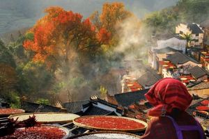 【篁岭晒秋】 挂在山崖上的篁岭古村,“地无三尺平”,数百栋徽派民居在百米落差的坡面错落排布,每当日出山头,晨曦映照,整个山间房屋晒架上五彩缤纷的丰收果实,绘就出美丽的“晒秋”农俗景观。春晒茶叶、夏晒山蕨、秋晒果蔬、冬晒乡俗……一年四季延绵有续。“晒秋”是篁岭古村500年来延续至今的晒谷物特色民俗景象。它反映了以篁岭为代表的山居民众原生态的晒物农俗,是劳动人民对丰收喜庆和未来生活所赋予的质朴美好的期待,并逐渐沉积为一种民俗和文化。