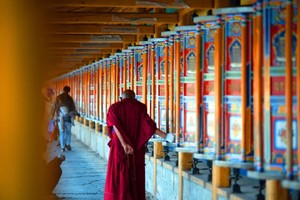 寺院规模宏大,这里有恢宏的寺院建筑群,供奉着无数的巨大佛像和各种精美的雕塑、壁画、法器等。拉卜楞寺超长的转经长廊是全世界罕见的,共2000余个转经筒,转遍每个转经筒至少需一个小时。一般游览拉卜楞寺的方式都是顺时针绕寺一圈,这也是藏传佛教的朝圣仪式。在拉卜楞寺西南角有座古老的木桥,横跨夏河,过桥上山,站在晒佛台上能将拉卜楞寺的全景尽收眼底。带给他的信徒以平安与圆满。感兴趣的小伙伴可以沿着转经长廊推转经筒,感受藏民文化。