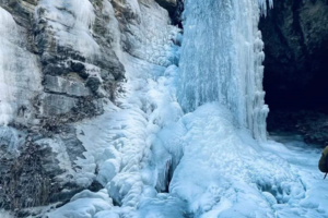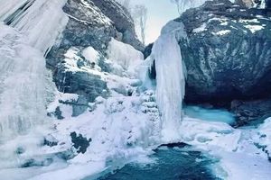 山谷深处,一道高10米、宽5米的冰面飘于崖边,像壮美的瀑布一样,冰瀑右下边的冰面已经被“撕破”,露出后面的凹型空洞,宛若花果山上的水帘洞。洞口的冰瀑珠帘玉垂如在开半帘的厚重帏幕帘,让洞里充满神秘感。近距离接触冰瀑,由上而下的流水冻结了各种姿态的冰瀑,非常震撼,两边黝黑的岩石衬托着冰瀑更加洁白迷人。