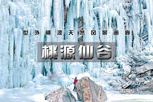 桃源仙谷属于云蒙山地域,植被茂密,潭瀑众,有一湖六瀑十三潭及一泉四池等景观,每到冬季,峡谷内的瀑布以及有落差的溪流就结成形色各异的自然冰雕。这里不仅有瀑宽几十甚至达百米的北京最大的人工冰瀑,更有很多瀑宽不等的自然冰瀑。