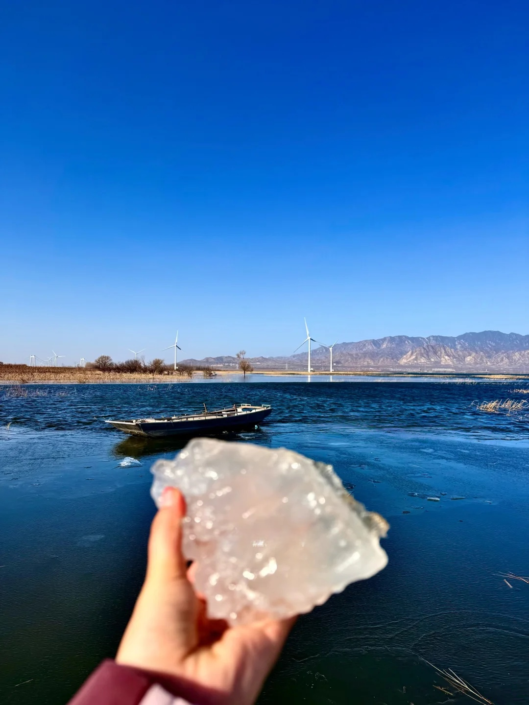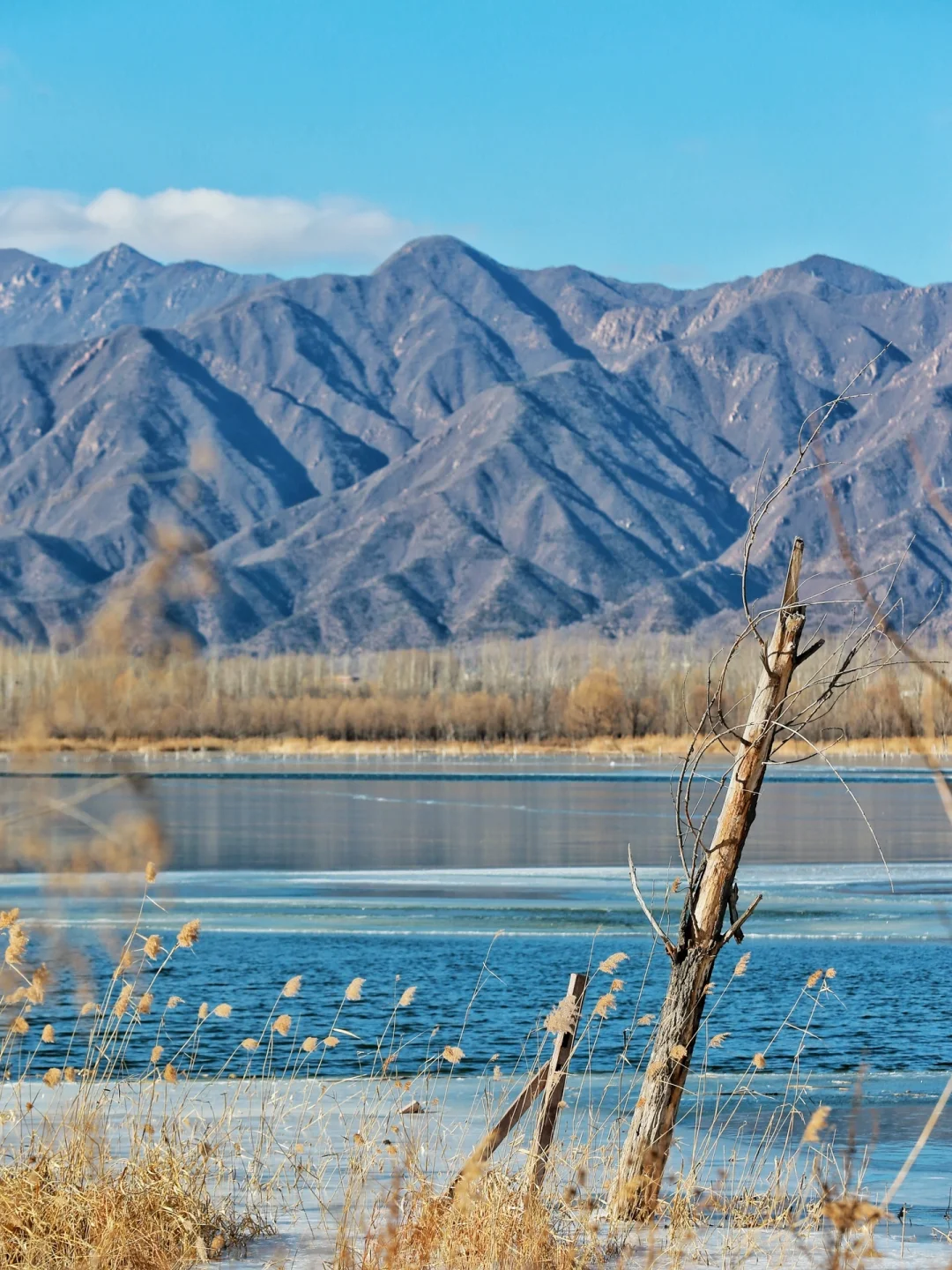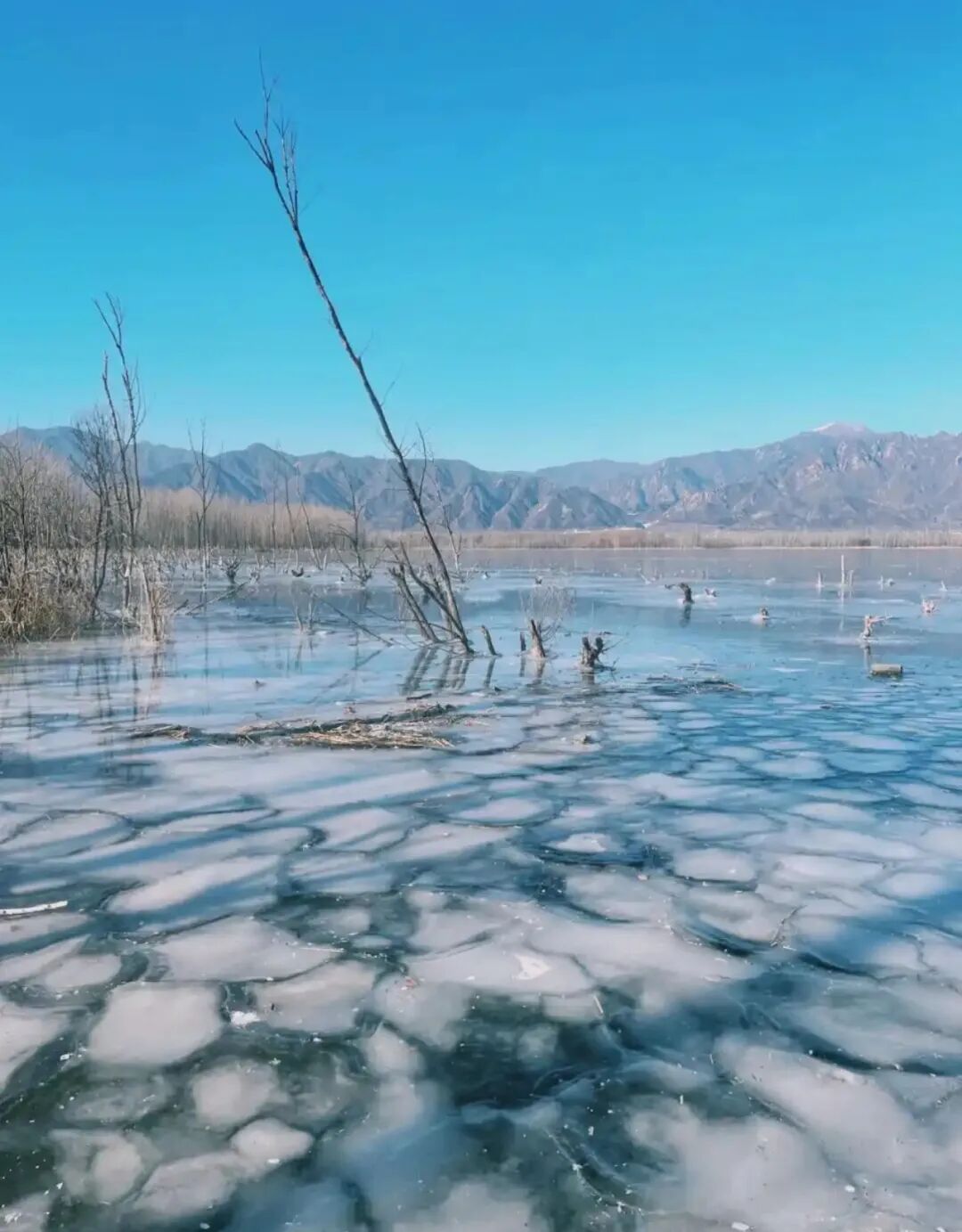 冬天的妫水河,太美了!蓝白相间的冰面和远处的芦苇,远山背景下的冰面,真实通透!北京的冬季,总有一些神奇的蓝冰气泡湖。那里一片片结了厚厚的冰,徒步可以进入。此处冰中镶嵌着气泡,有的大如蘑菇,有的小如米粒,重重叠叠,像是湖底呼出的气息,又像是藏在厚厚冰层的精灵,美轮美奂。冬天冰层冻的很结实,很安全,但很容易摔跤,大家可以尽情在冰面各种玩耍、拍照……