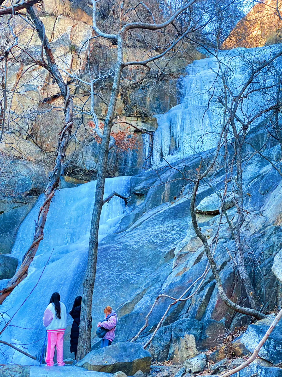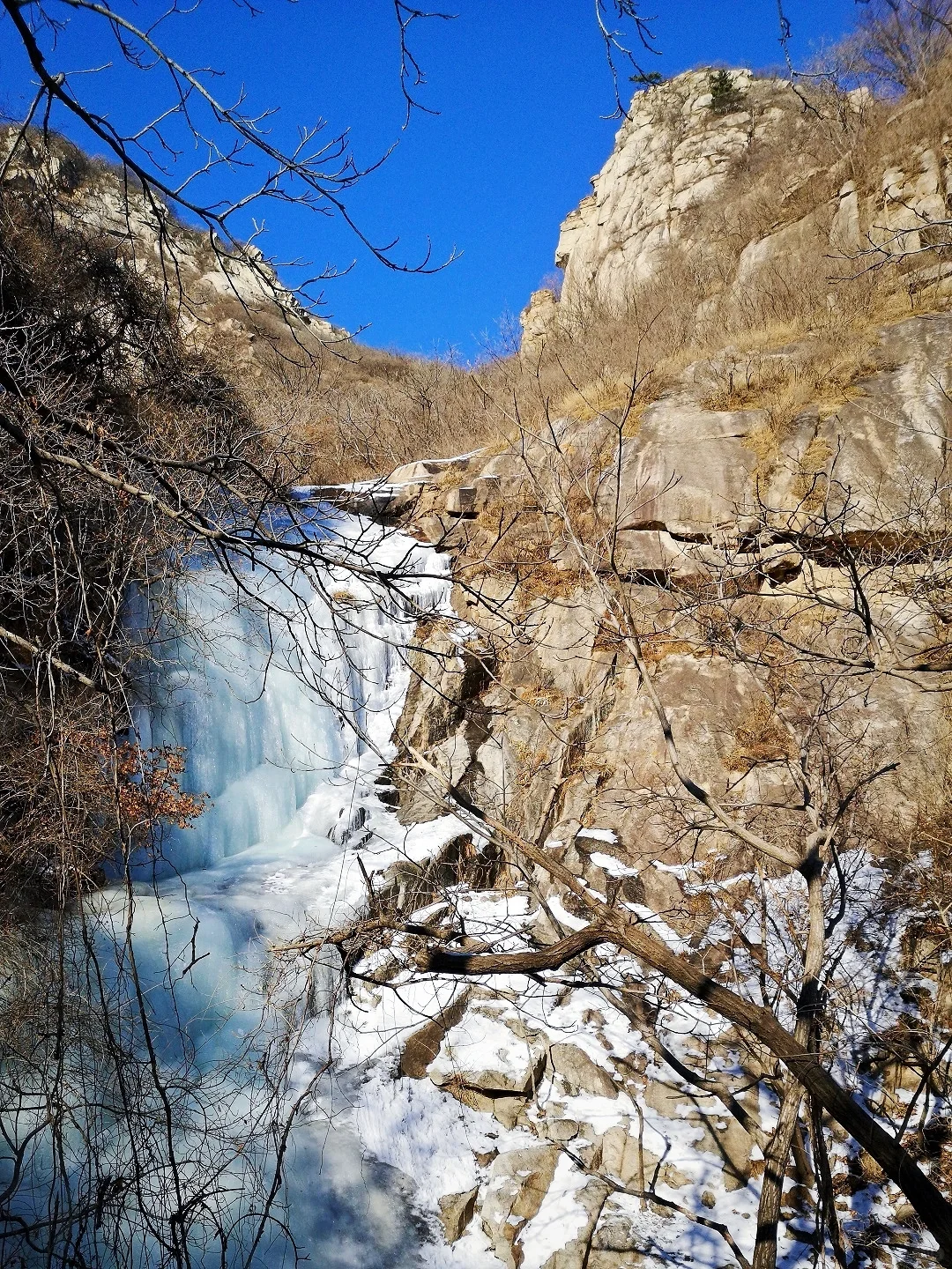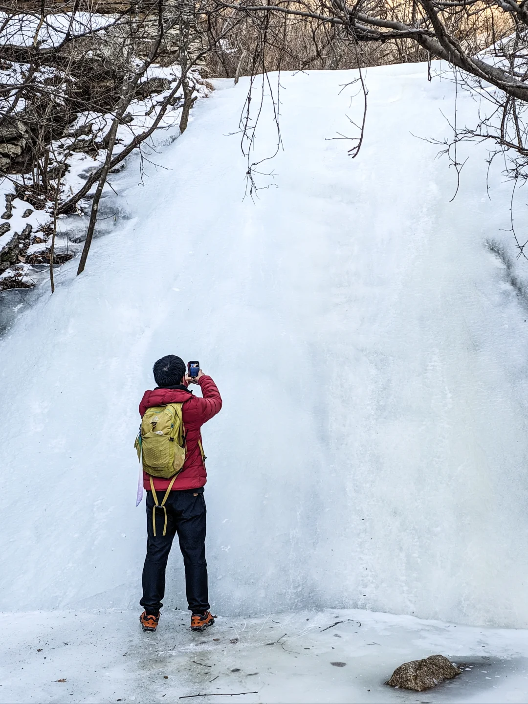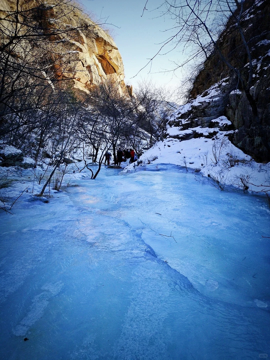 逐渐深入山谷,大片冰瀑赫然眼前,雪白中透着淡淡的蓝色。水受重力往低处流,这是自然规律。俗话说,山有多高,水有多高。植物地下根系不能承载过多的雨水时,就会渗透出土层,顺流而下,形成山涧水。当然也有山泉水汇集的贡献。湍急的山涧水在冬季流动中慢慢结冰就形成了难得一见的冰瀑。引得大家驻足拍照。