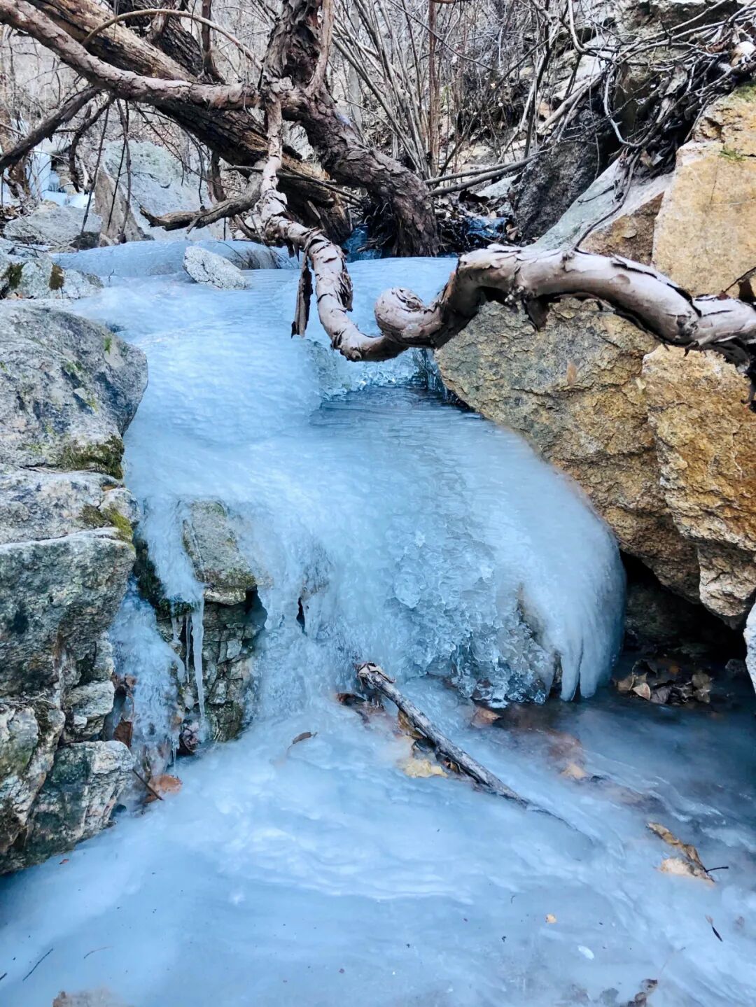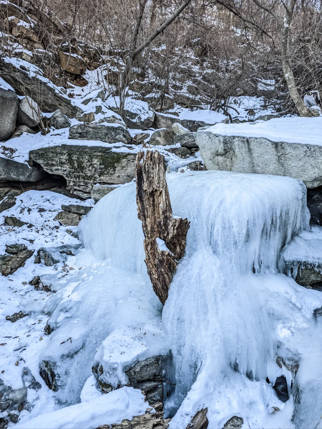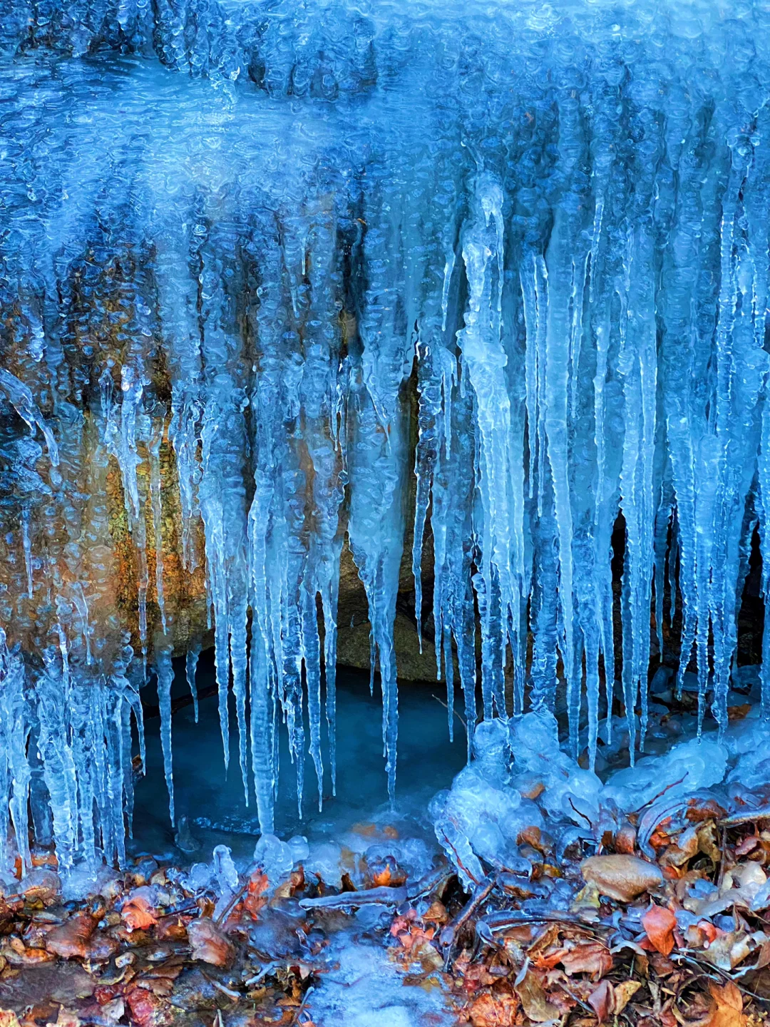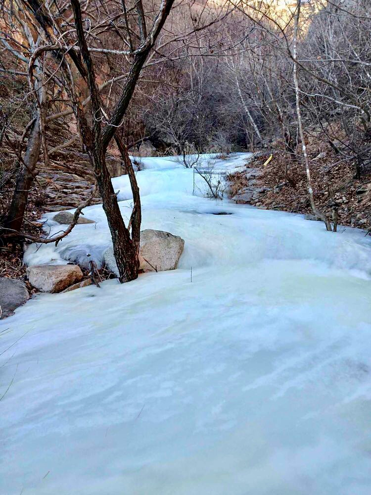 逐渐深入山谷,大片冰瀑赫然眼前,雪白中透着淡淡的蓝色。水受重力往低处流,这是自然规律。俗话说,山有多高,水有多高。植物地下根系不能承载过多的雨水时,就会渗透出土层,顺流而下,形成山涧水。当然也有山泉水汇集的贡献。湍急的山涧水在冬季流动中慢慢结冰就形成了难得一见的冰瀑。引得大家驻足拍照。