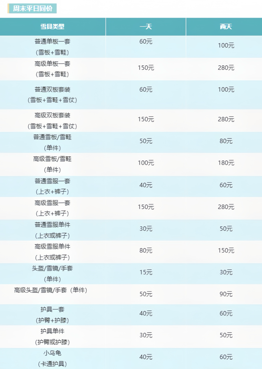 3)雪板雪鞋等雪具不含,可代为租赁,雪具租赁团队价格(崇礼城区店内租用)