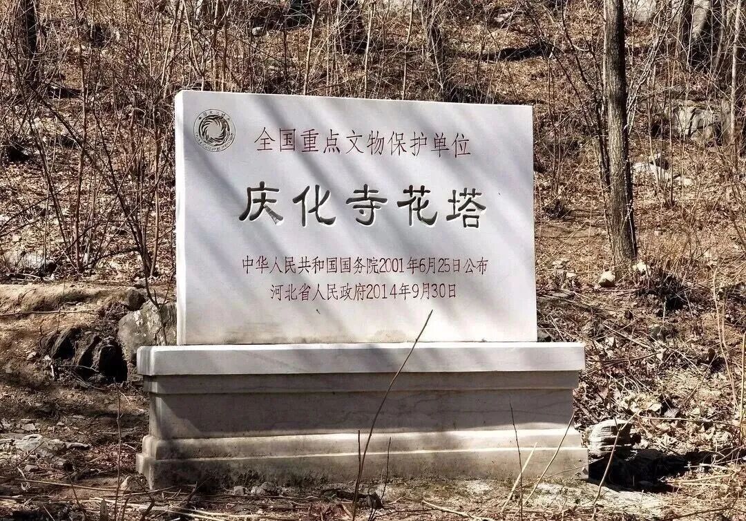 庆化寺,很壮观,三面环山,前面有水,风水宝地,大雄宝殿旁有个奇景,就是有个龟上长了一颗柿子树,正在龟身上,树根把龟分成两半,不知多少年才能形成。南约百米的山坡小平台上矗立的便是庆化寺花塔,样式非常美妙,塔身上的砖雕精美至极,据说,塔刹为圆形的花塔在我国北方仅存两座,一座位于北京房山的万佛堂,另外一座就是涞水庆化寺的花塔。被列为全国重点文物保护单位,后得以修缮,并在塔周围安装了监控摄像头,以使庆化寺花塔得到有效的保护。