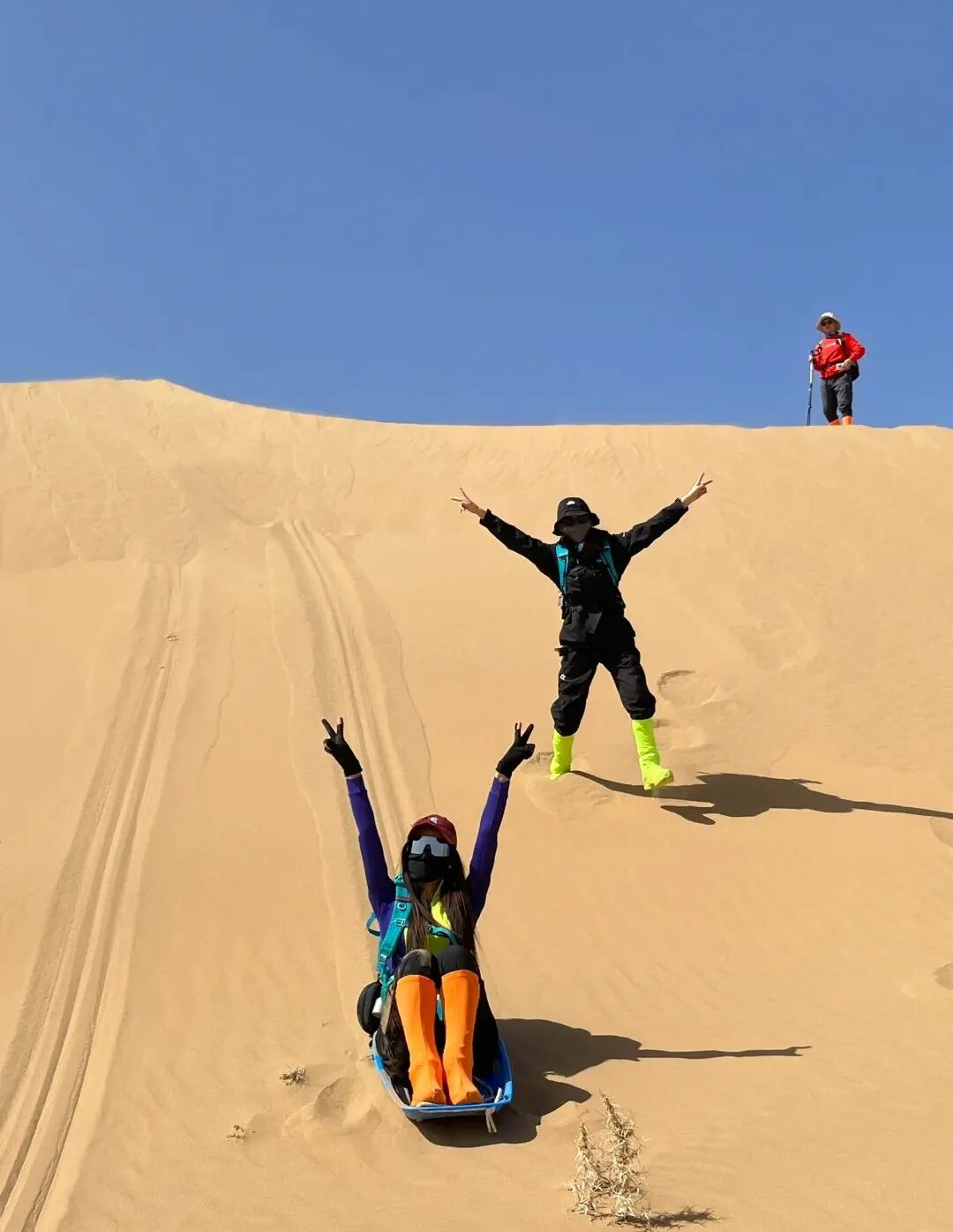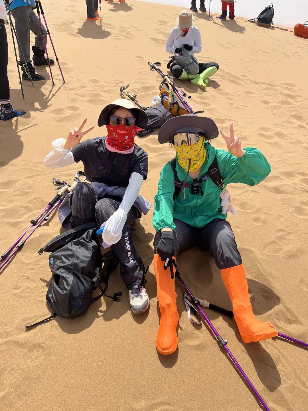 2、【上衣着装】排汗内衣+保暖层+冲锋衣,沙漠昼夜温差大,需备一件里面穿的轻羽绒内衬, 里层尽量不要棉衣。好点的雨衣,遮阳帽,魔术头巾,太阳镜,手套;【下身着装】打底裤+冲锋裤,厚款中高帮运动袜,防水登山鞋,雪套,沙套。