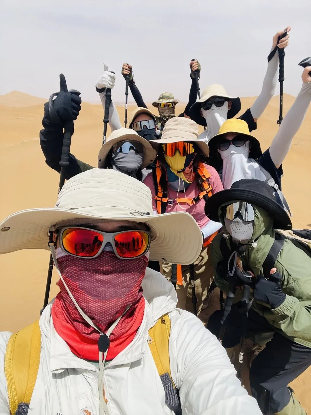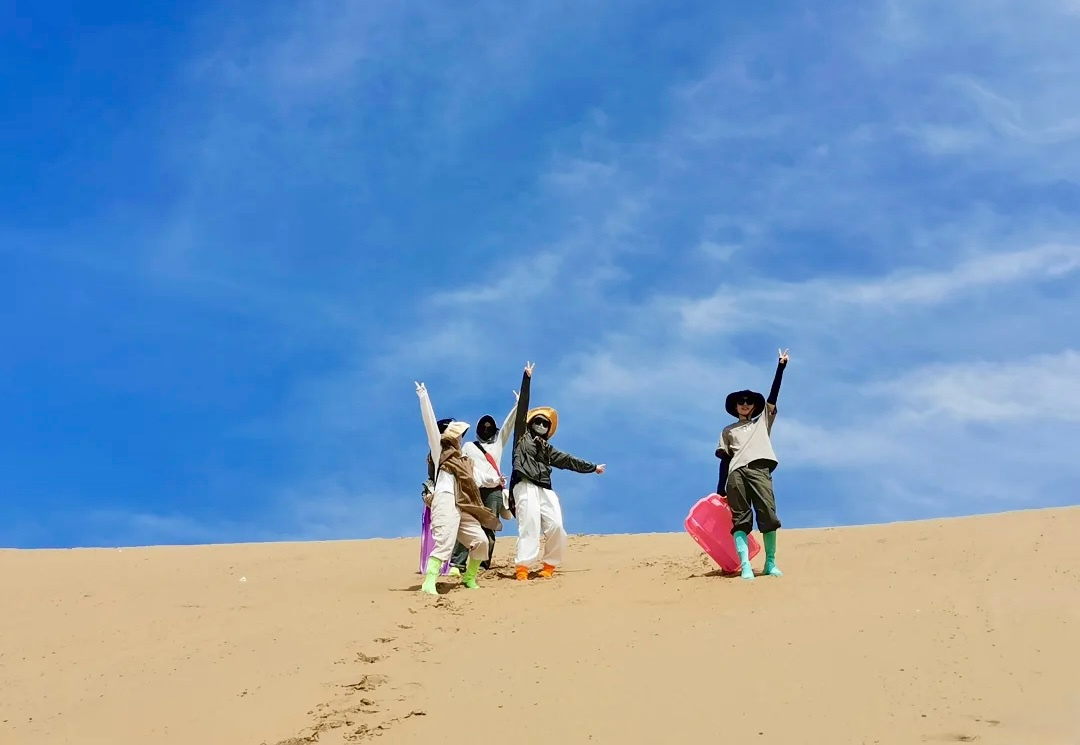 3)沙尘暴:库布齐沙漠的沙尘暴发生的概率极低,即使发生强度也不会很大,所以并不会带来危险,而且沙尘并不耽误人的正常行走,只是行军速度会减慢。遇到沙尘时带上防风镜、口罩、头巾,在凉爽的沙尘里行军也是一种独特的享受。