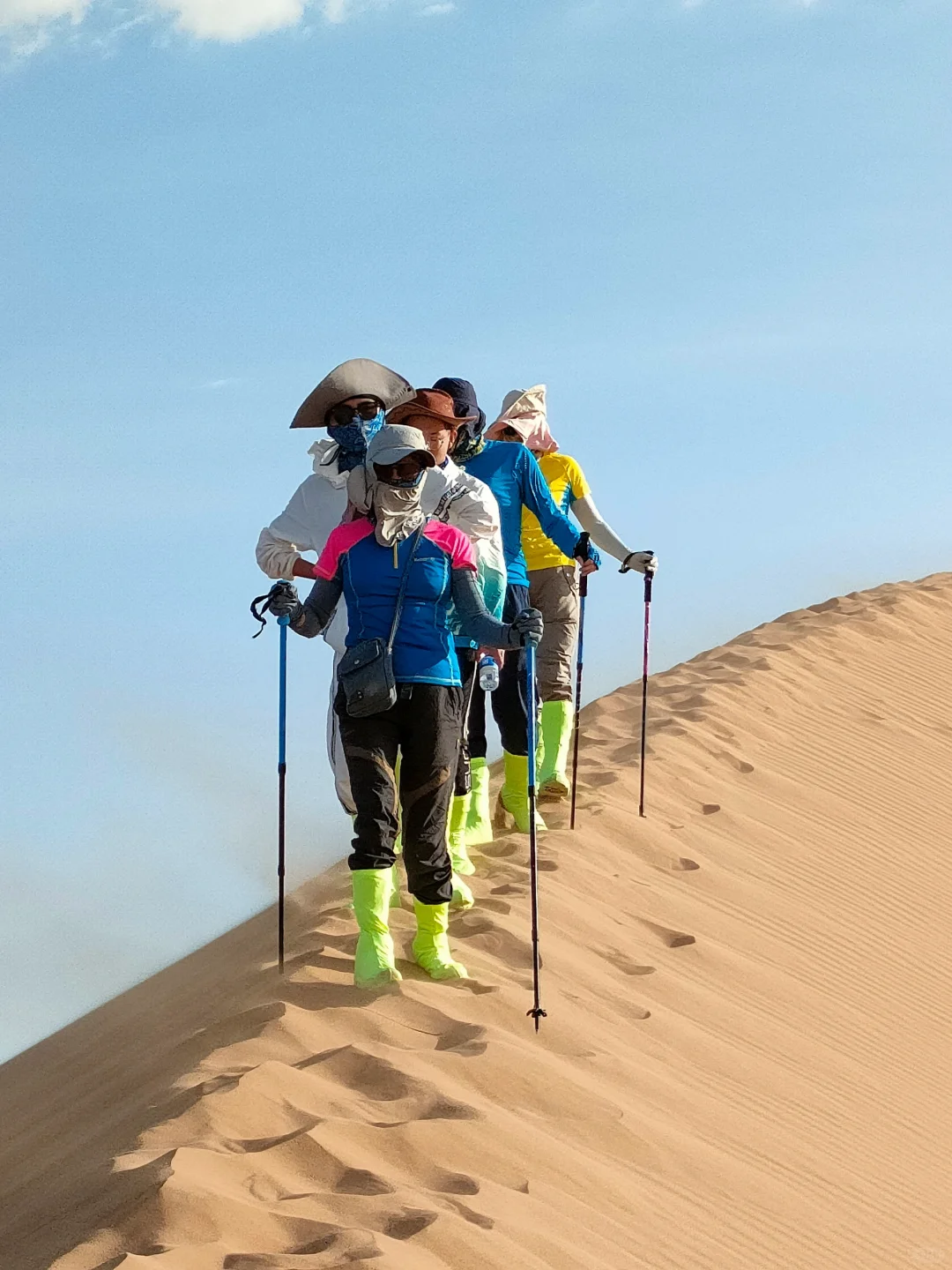 2)着装:沙漠气温比较炎热,晴天白天气温30度左右,晚上气温在零下5度左右。所以着装搭配建议根据自身状况做好保暖,防晒,防寒工作。为了防止脚起泡,创可贴,发现脚有不舒服的部位赶紧贴上,袜子也要换成专业徒步加厚袜子。