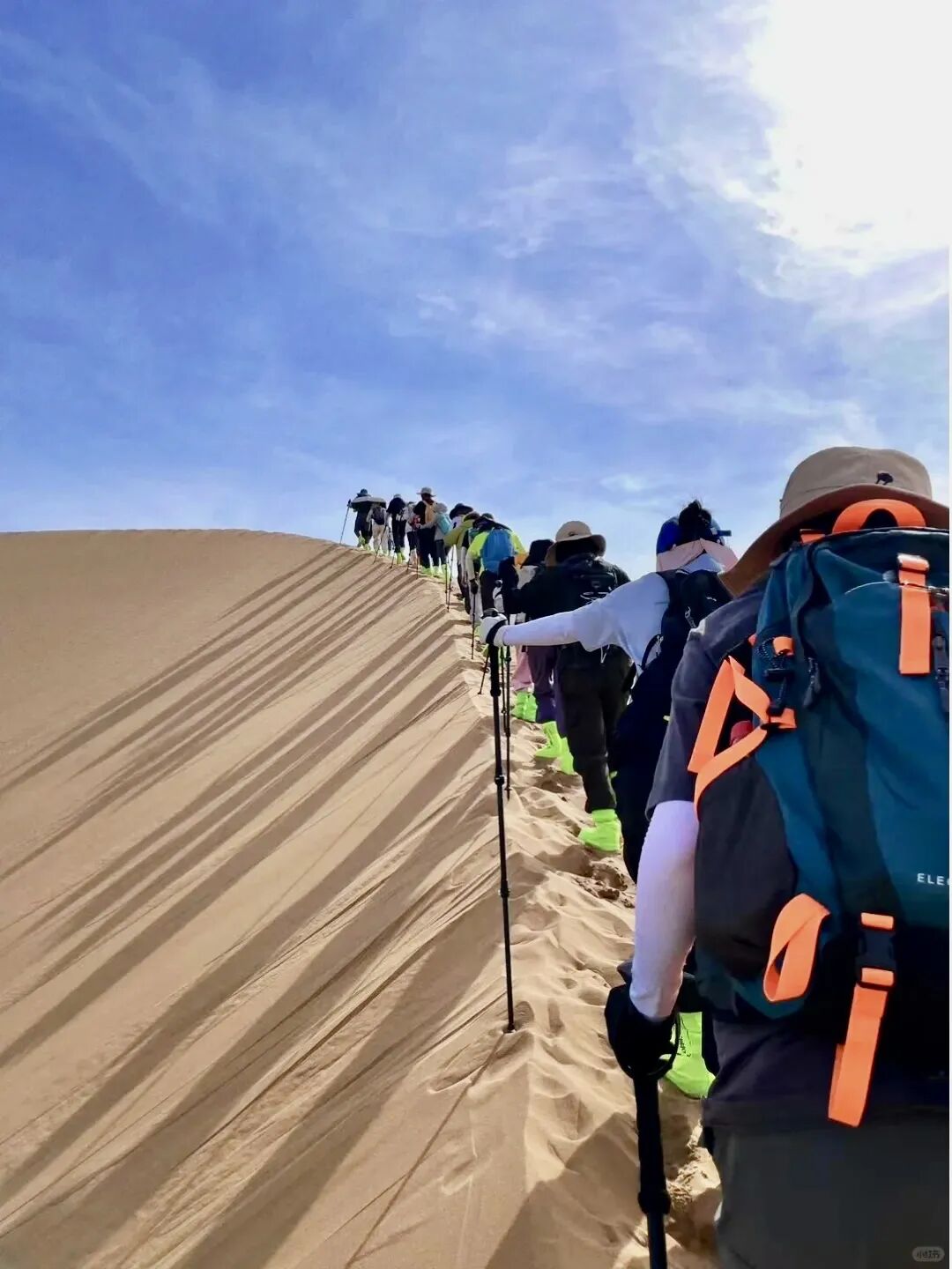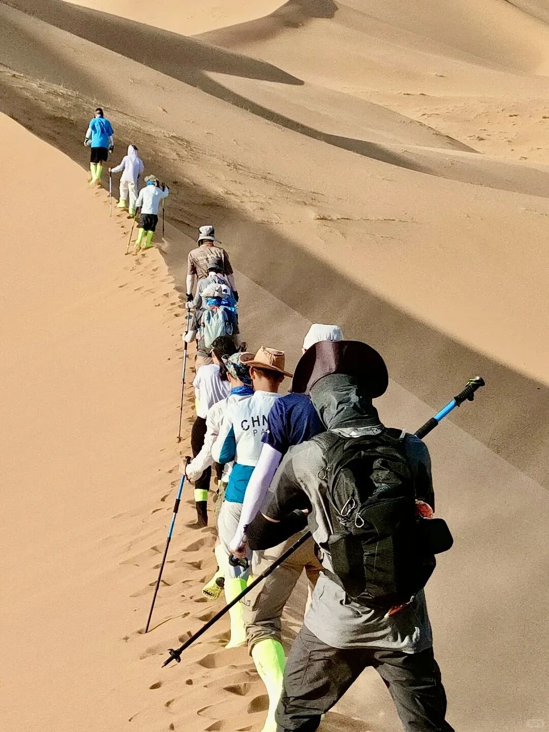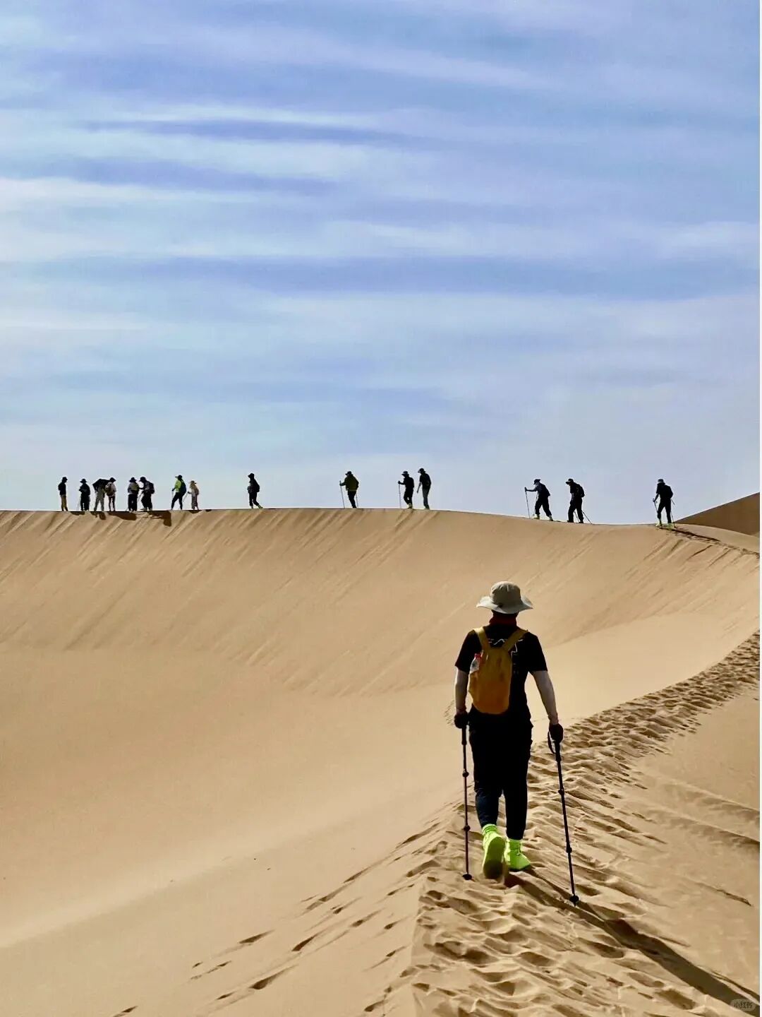 7)沙漠行走:背包负重行走时经常要翻越沙丘,为了给双腿减轻承重,用带大雪托的双杖辅助行走会起到事半功倍的效果,尤其是上坡,会为双腿分担至少四分之一的承载力,使身体延迟疲劳,也提高了行进速度。上坡时行走最好选择前面人的脚印走,跟走在台阶上差不多,利用手杖的支撑,会很轻松的翻越沙丘。在平缓的地方行走最好不要跟着前面的脚印走,最好在偏离十几公分的没有经过踩踏的地方走。