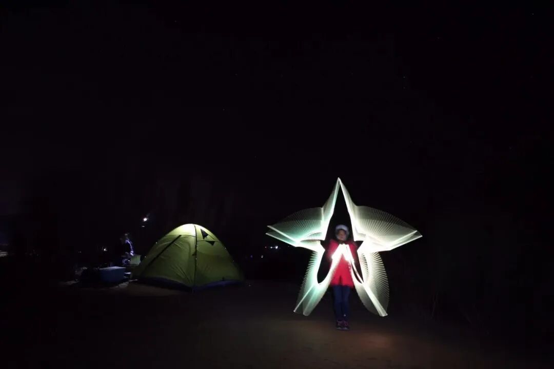 6)营地:帐篷迎风面最小的一角冲向来风,打沙钉时先把浮沙扒掉,露出硬度大的潮湿沙子,沙钉以大于45度角度斜插在湿沙子里面,一般能防止7-8级的大风。把除了帐篷门的其他三个部分用沙子挡起来,也能抵抗强风和保暖。