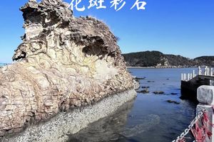 花斑彩石 去烟墩角,还可以观赏一下花斑彩石。相传是女娲补天之五色石遗落海中化成。实际上此石为古生代寒武纪燕山运动所形成。彩石天然独特的形态,有中华海上第一奇石的美称。花斑彩石位于马道镇烟墩角村东南方海中,距岸50多米,长约35米,宽约20米,高约9米,花斑彩石主要由黄、白、褐三种颜色组成。