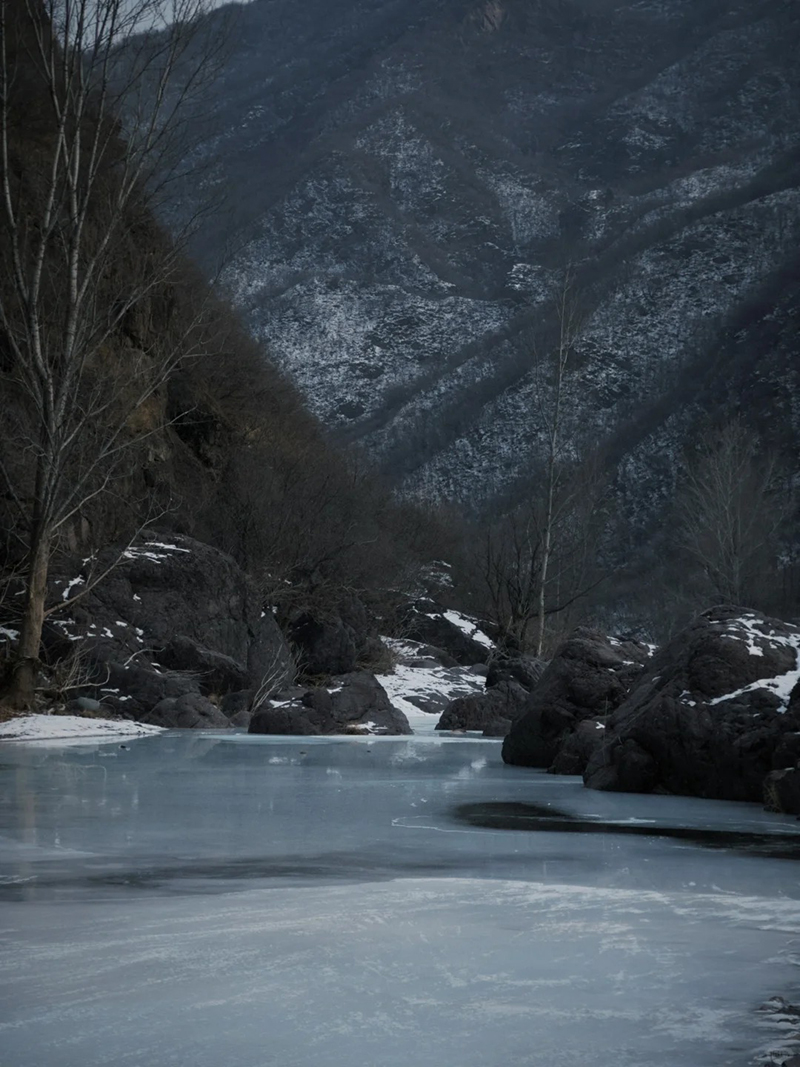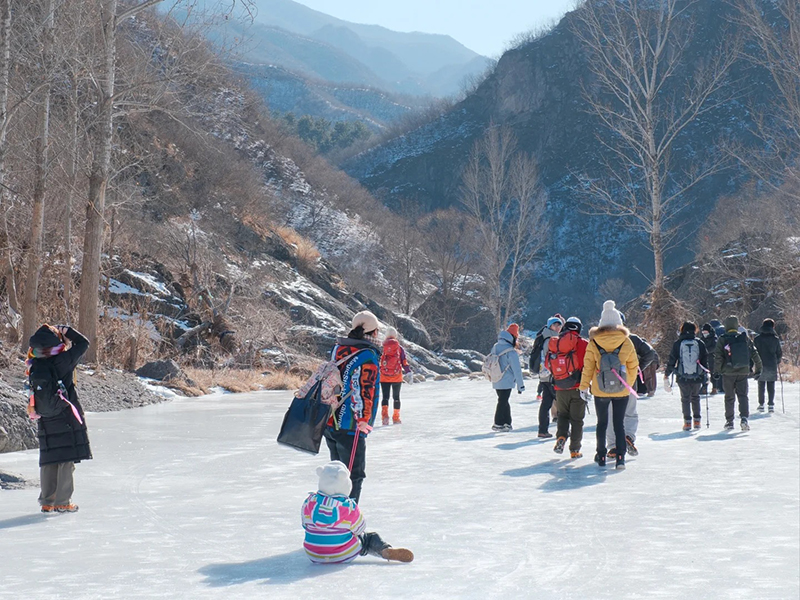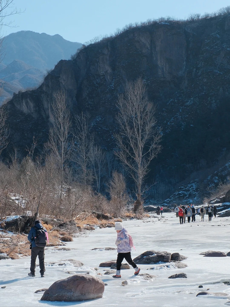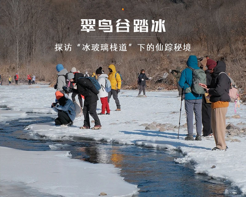 - 11:00|上午到达目的地,稍做休整后徒步进入桃花沟,这里不同于夏季翠鸟谷的溪水潺潺,一到冬季就结了厚厚的冰霜,沿着结冰的河面,我们可以发现许多隐藏在这里的自然奥秘;中午择地路餐,美食都分享一下吧;饭后继续沿河谷穿越游玩。