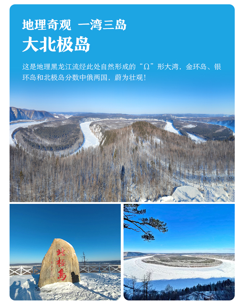 √ 游览13:30-16:00,黑龙江流经此处自然形成的“Ω”形大湾,因其是距离中国最北点最近的岛,故称为"北极岛"。黑龙江流经此处自然形成的“Ω”形大湾,因其是距离中国最北点最近的岛,故称为"北极岛"。两边的「银环岛」和「金环岛」是俄罗斯领土分别行程两个180度的大江湾。一江之隔只能观望中间伸向对岸的半岛是中国北极岛「北极岛」。「瞭望塔」观一湾三岛。「双妃湖」传说清朝同治皇帝一个心爱的妃子和同胞姐姐曾流落至此,该湖由大、小两片相邻的湖水组成,夏日远山苍苍,湖水盈盈,伯伯清澈,水草摇曳。冬日冰封的湖面覆盖上了厚厚的皑皑白雪,躺在静谧的兴安深处。(游览时间:2.5小时)