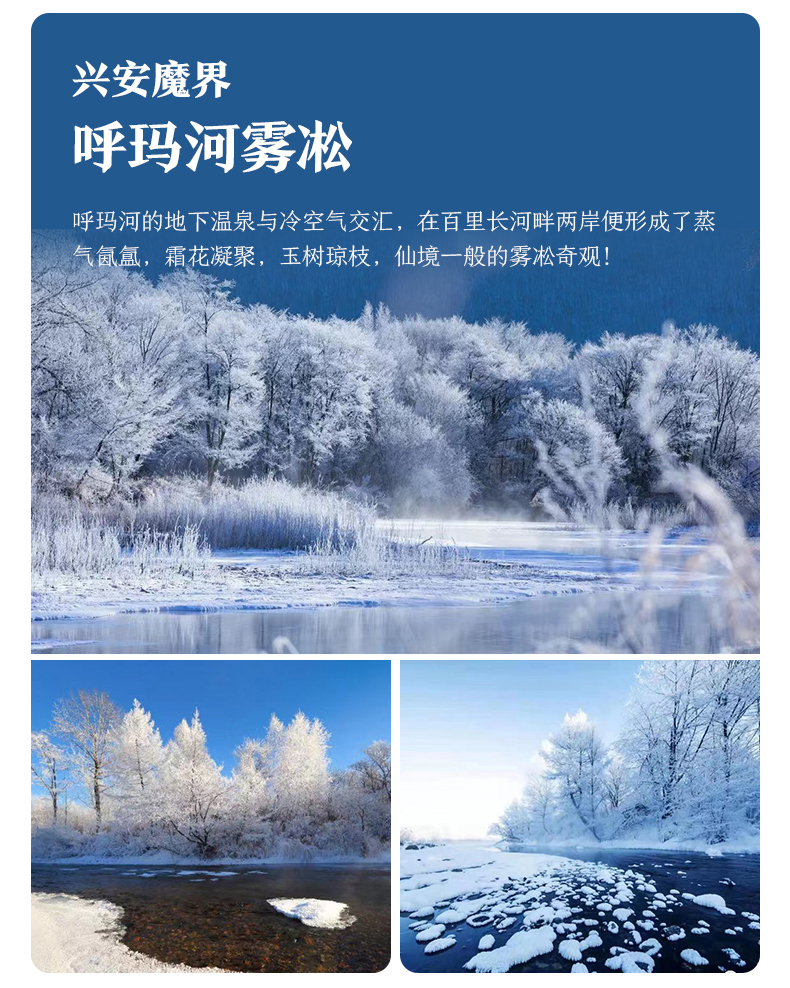 √ 车程+摄影06:15-08:00,「呼玛河雾凇」在最冷小镇的冬天里。踏着绵柔的积雪,寻觅入镜的风景。等待冉冉升起的紫色天际,虚幻的冰河在雾气缭绕下纯净里透着诱人的色彩。河畔与雾凇的辉映,若隐若现似展开的画卷,拿起手机定格这驻足的瞬间,尽享这极寒下冰与雪的盛宴。「最冷小镇」地标广场打卡。(摄影时间:1.5小时)