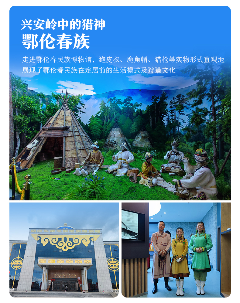 √ 游览09:00-09:40,馆内分为林海猎民、攫取经济、传统工艺、物质文化、精神文化五个部分,以实物形式直观地展现了鄂伦春民族在定居前的生活模式及狩猎文化。鲜卑民族博物馆内陈列着鲜卑民族的生产生活用具,再现2000多年前鲜卑民族的生产生活方式及经济状况。鲜卑属东胡一支,秦末汉初之际,匈奴与东胡发生战争,东胡败,一支退居乌桓山,历史上称为乌桓族,一支退居在大鲜卑山称之为鲜卑族。经考证,大鲜卑山即为现在的大兴安岭。(游览时间:40分钟)