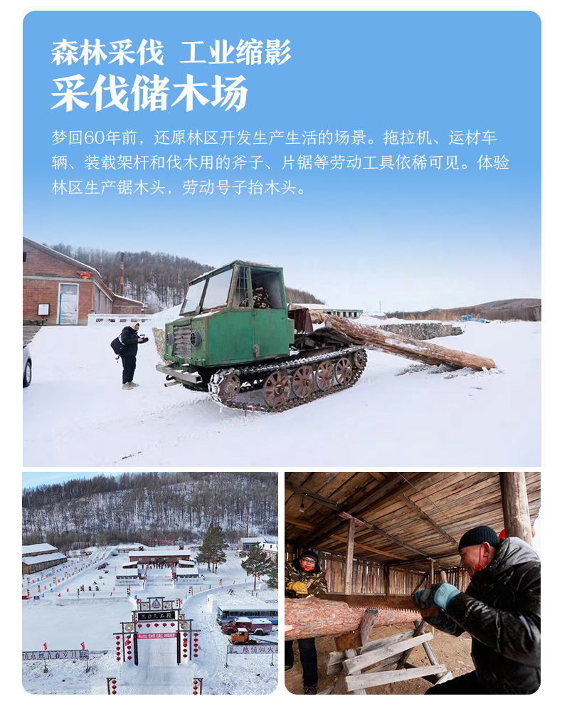 √ 游览14:40-15:40,国家在1964年开始开发大兴安岭林业资源,木材运往祖国的四面八方,为新中国的经济建设付出了巨大贡献。梦回60年前,原汁原味地充分还原林区开发生产生活的场景,重温老林业工人的青春岁月。拖拉机、运材车辆、装载架杆和伐木用的斧子、片锯等劳动工具以及老物件收音机、毛主席像章、毛主席语录样样都有,看到一幅幅的老照片,一下子就把大家带到那个时代。亲身体验当年林区木材生产的全过程,锯木头,劳动号子抬木头。当代已由传统林业采伐向现代林业植树育林转变。绿水青山就是金山银山,青山不老绿树长存。(游览时间:1小时)