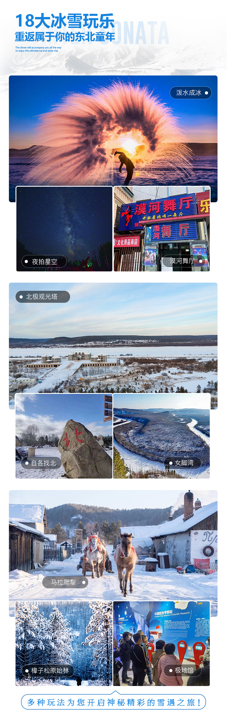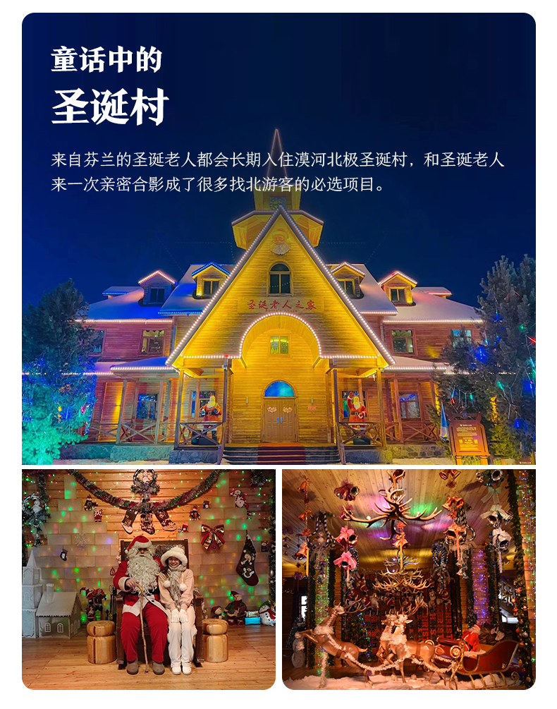 【玩法】:赠送18种特色玩法,不参与不予以退换。【鄂伦春民族博物馆】【森工采伐】【白桦林】【兴安魔界】【白桦林】【呼玛河雾凇】【古城岛雅克萨古战场】【藏宝山日落】【女脚湾】【樟子松原始林】【北极观光塔】【极地馆】【漠河舞厅】【松苑公园】【马拉爬犁】【喂养驯鹿】【各种寻北】【芬兰圣诞老人合影】