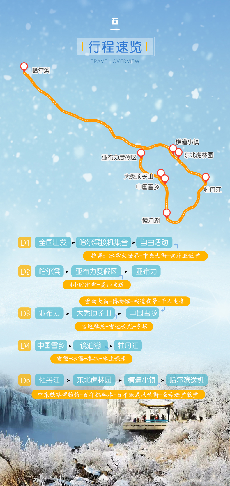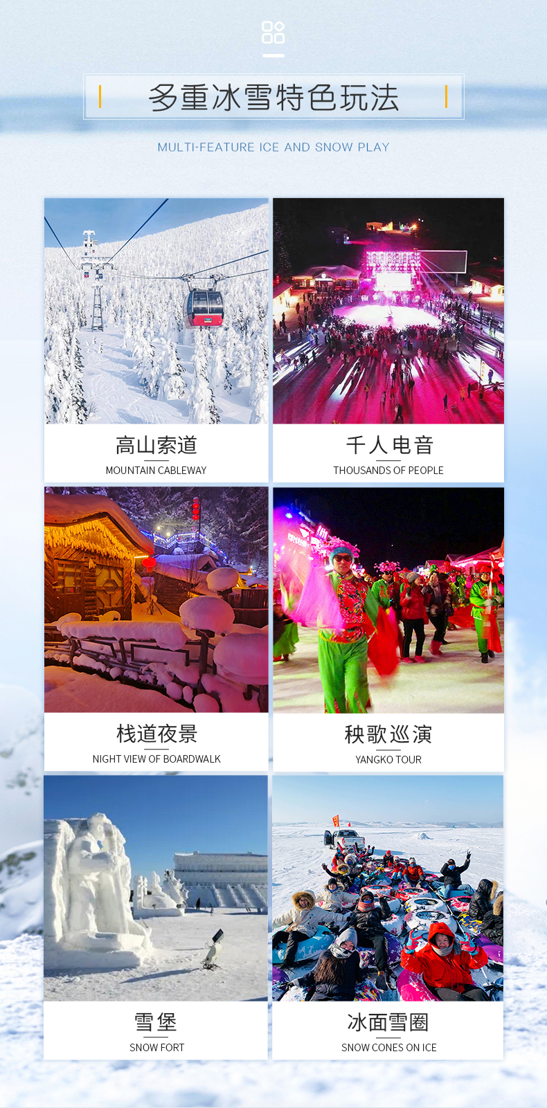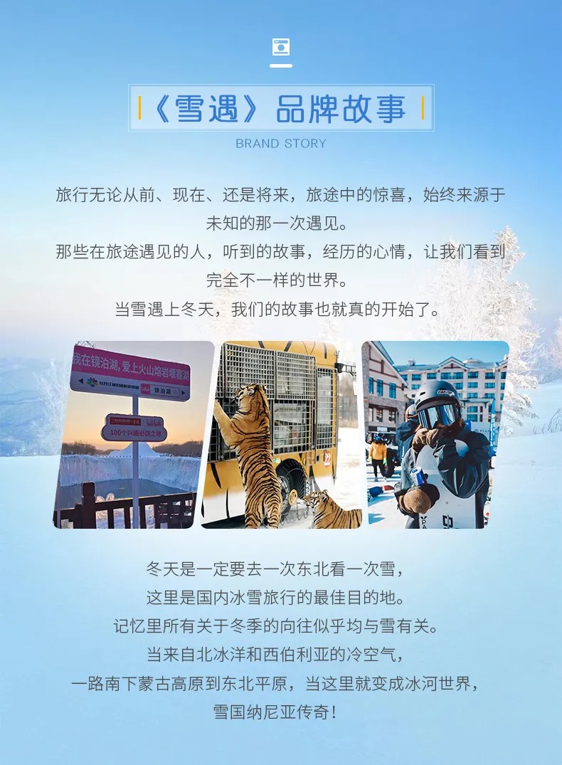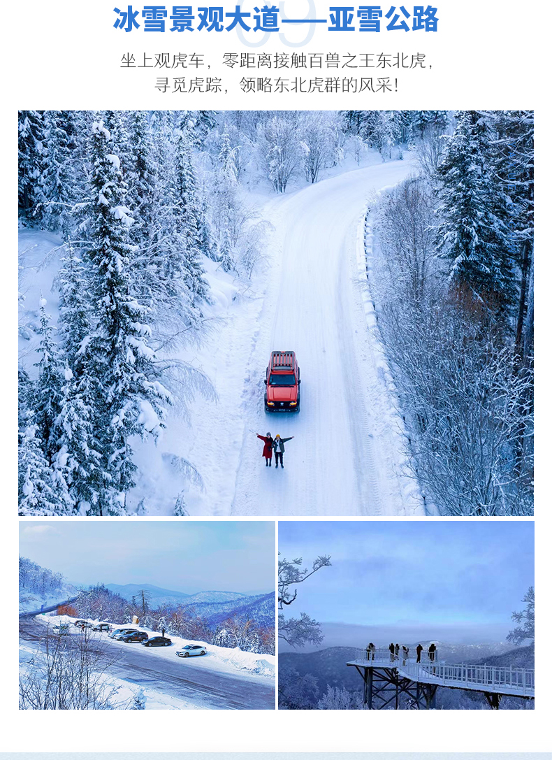 1.门 票:4小时亚布力滑雪票(雪板+雪鞋+雪杖)、龙江主峰套票、中国雪乡门票+环保车票、镜泊湖景区套票、东北虎林园门票;