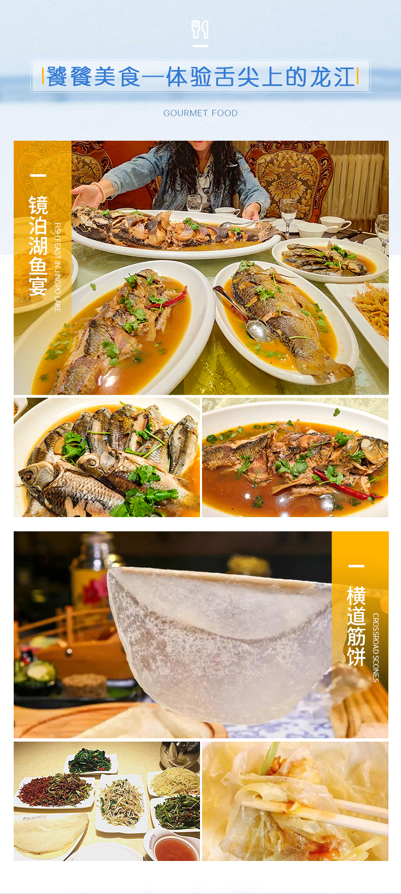 3.餐 饮:4顿早餐、2顿正餐(镜泊湖鱼宴、横道筋饼)