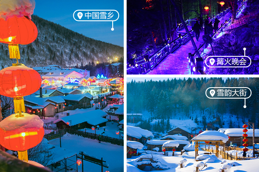 √ 活动19:00-20:30,我们在雪韵大街上欣赏东北正宗的「秧歌巡演」与「篝火晚会」,热情的音乐欢迎五湖四海的客人!您亦可以爬上「观光栈道」,俯瞰如梦如幻的雪乡夜景。
