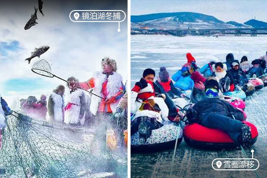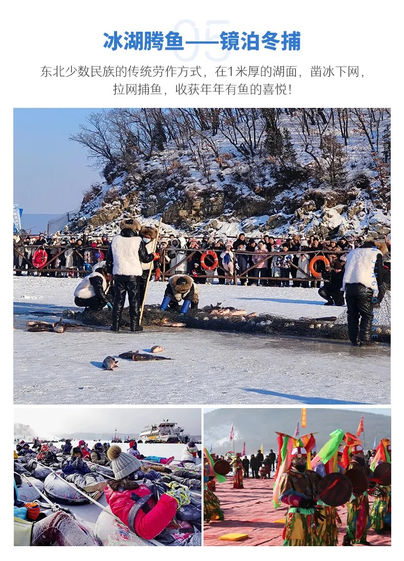 √ 游玩12:30-15:30,冬季的镜泊湖,进入景区大门,映入眼帘的奇幻是「雪堡」,可爱的IP雪雕,雪建光秀等雪雕作艺术品。吊水楼瀑布的崖壁上布满了水滴结冰的艺术杰作「冰瀑」,各种冰挂、冰柱和溶洞里的石钟乳多有相似,在平静的黑龙潭中完美的倒映着。同在水天雪地的大东北,黑龙潭的水温却在8摄氏度左右,上面是呈莹别透的水瀑布,下面却是从不结冰的黑龙,可谓奇特。在阳光的照耀下,冰瀑五新六色,她烂如,让人感叹大自然的鬼斧神工。乘坐冰上长龙或雪圈前往冬捕地,观冰湖腾鱼—镜泊湖「冬捕」,这是东北少数民族的传统劳作方式,在1米厚的湖面,祭湖醒网,凿冰下网,拉网捕鱼,抓头鱼,感受冰腾湖鱼的壮观场面和年年有余的美好祝愿!(游览时间:3小时)
