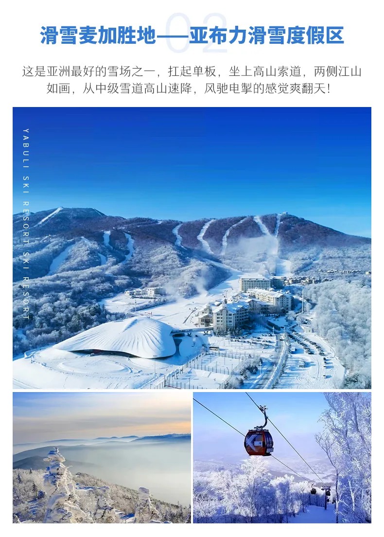 √ 车程08:00-11:00,【亚布力滑雪度假区】,这里是中国著名的滑雪胜地,因其雪质优良、硬度适中,成为了世界滑雪爱好者的天堂,亚冬会等国际赛事常在这里举办。