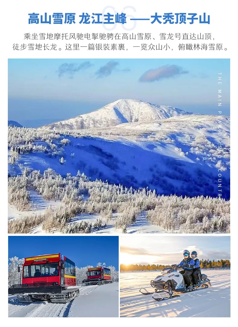 √ 游玩12:00-15:00,乘「雪地摩托」穿越林海雪原是一次非常难得的体验,那种风驰电掣的感觉非常刺激。走在雪地长龙栈道内,登上「雪地长龙」,大雪覆盖的山上,只有高山岳桦婀娜起舞,岳桦的性格就是在高山上生长,别看它矮小而且虬枝蔓延,但它是树木中顽强的代表。祭拜「雪龙顶冬坛」,仿佛北京天坛底座建造了两条巨龙。