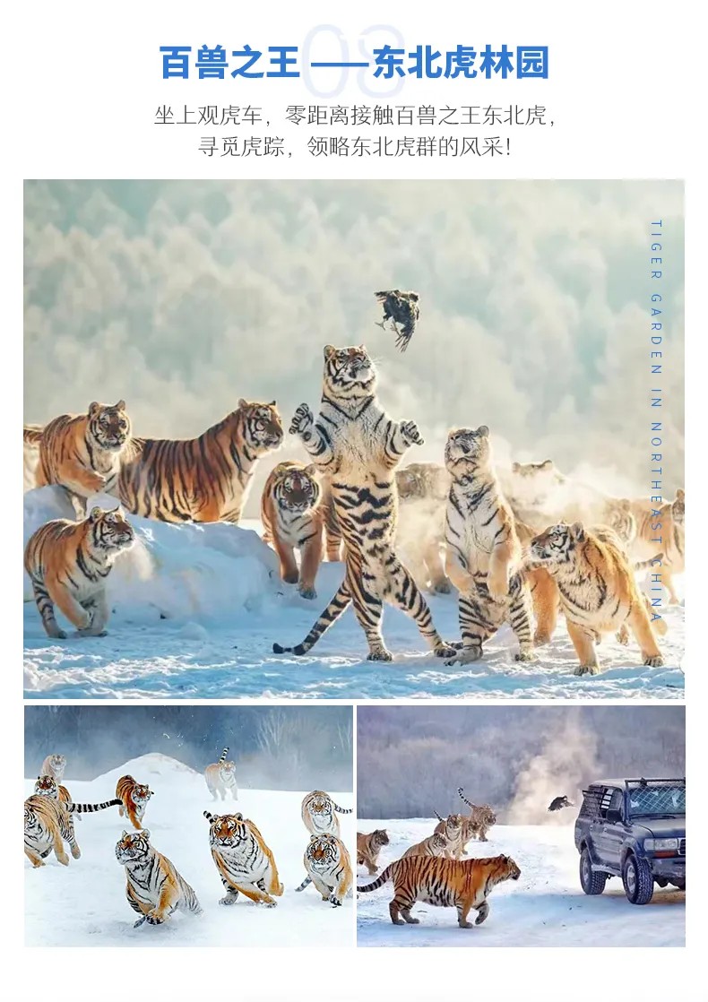 √ 活动09:00-10:30,【东北虎林园】目前建有野化驯养区、成虎区、幼虎区、虎王区、育成虎区、种虎区、狮虎区、非洲狮区、步行区和观虎台10个参观景点,这里的老虎个个有强健的体硕,走路时都能感觉到那种肌肉感,东北虎虽然是猛兽,却有着大猫的可爱感,领略东北虎的风采!(游览时间:1.5小时)