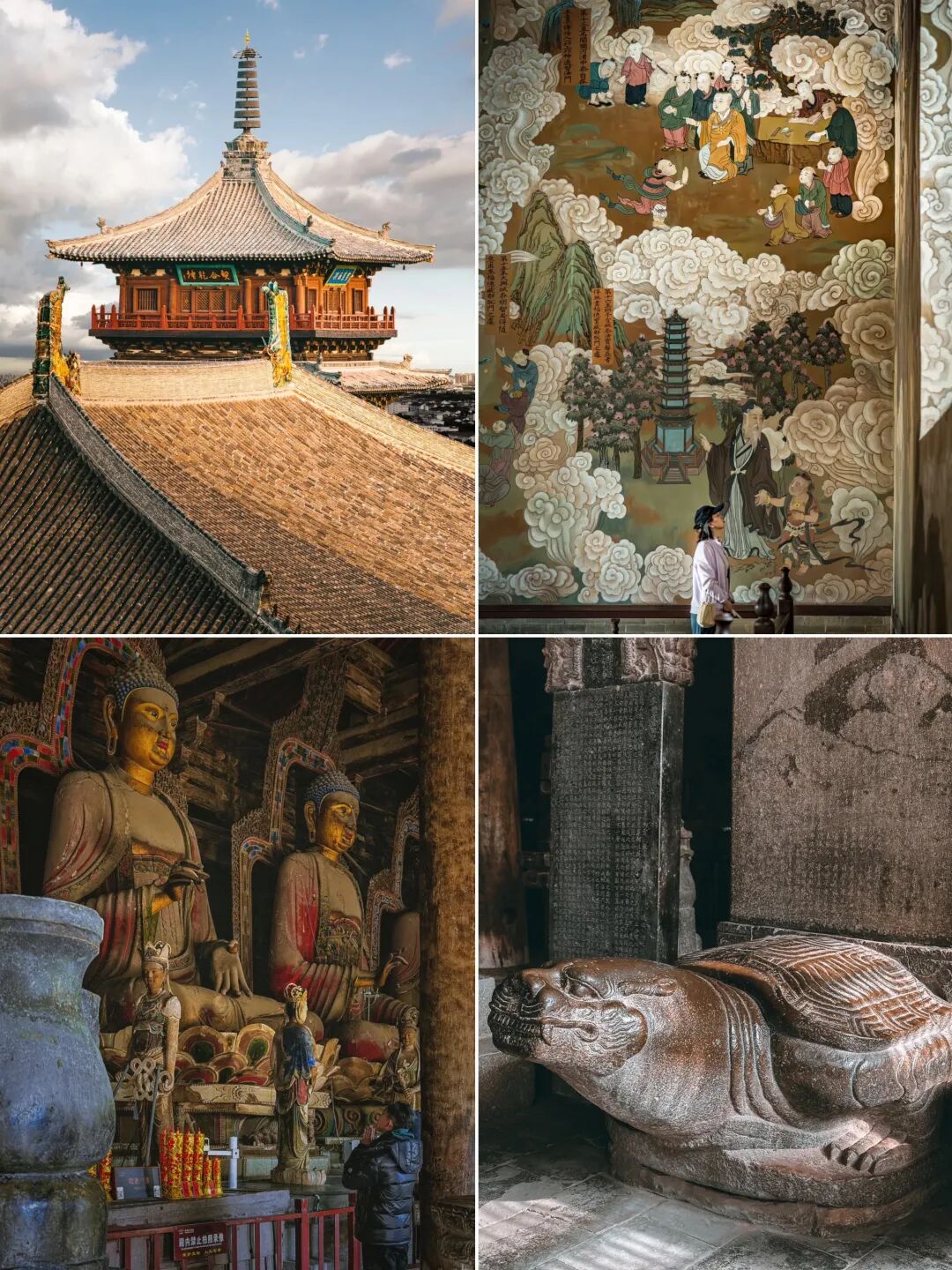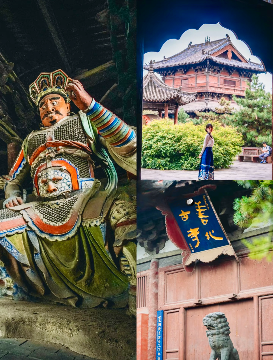 善化寺 俗称南寺,大门是落成于金代初年的大型官式建筑,是现存最古老的金代建筑之一,更是我国屈指可数的殿堂式木构建筑,免门票,景区门口预约凭预约码进去即可,寺内主要参观为天王殿、三圣殿、大雄宝殿、普贤阁,◆大雄宝殿,辽金建筑,内有五方佛从东到西依次为东方阿閟佛、南方宝生佛、中央毗卢遮那佛、西方阿弥陀佛、北方不空成就佛。◆山门四大天王,在天王殿是明代塑像,天王的“表情包”太有意思了特别逗。