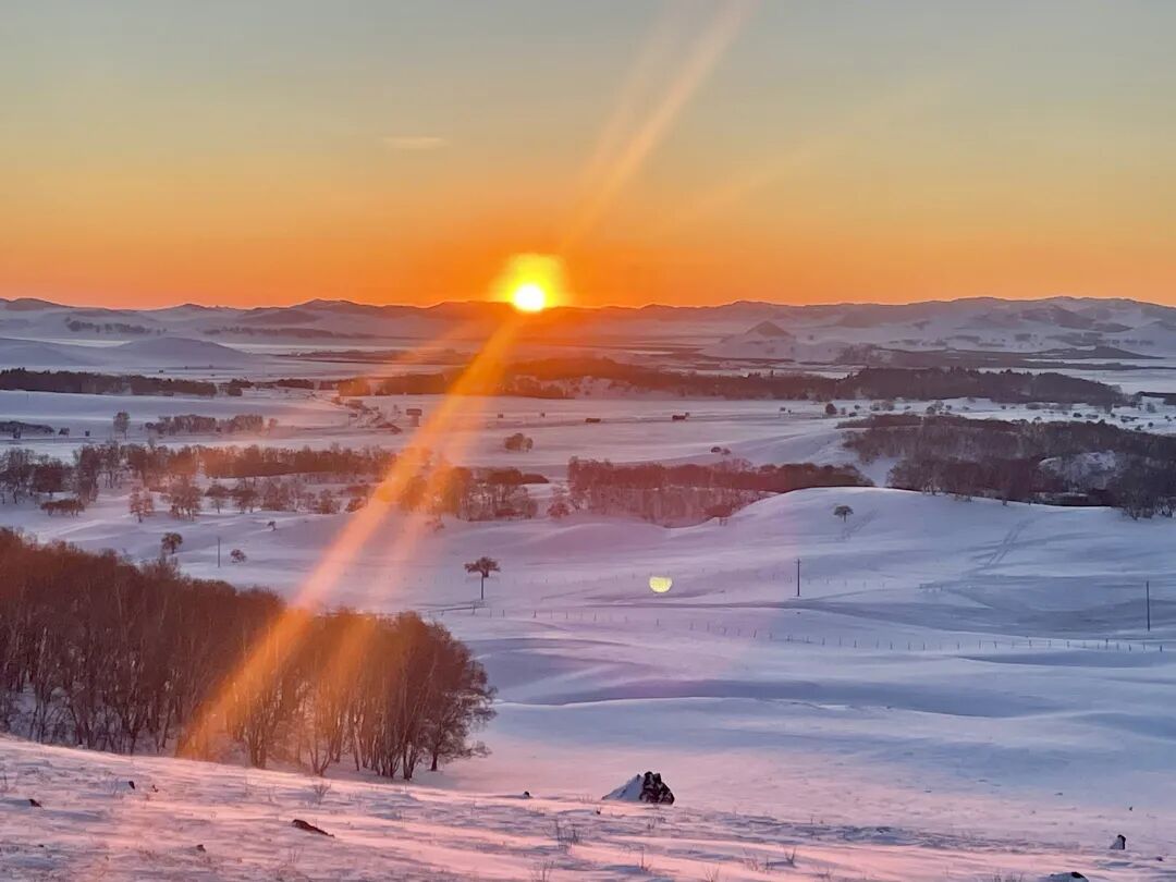 随着夕阳西下,我们驱车来到【鹰窝沟】看日落,乌兰布统草原的夕阳,骏马与落日的搭配、光影与自然的交融,天边渐变的红色与蓝色的融合,构成一幅精美的画卷,站在白雪皑皑的草原,欣赏着落日余晖,品味着壮美残阳,看着夕阳一点点从地平线消失,这里有雪丘之上的排排白桦林,在阳光照射下白桦树干与白雪争辉,长长的树影拖在雪丘之下层次分明,温柔铺展一幅绝美画卷。幸运的话,还能看到牧民驱赶羊群、牛群回家。