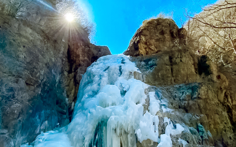往日流水潺潺的河溪,凝结成洁白的“玉带”在山涧舞动。悬挂在崖壁之上,山谷之下,一派琼妆玉砌,凝固成冰瀑,冰床,冰梯,冰花,冰凌,闪着银光,似乎把人带进了瑶池仙境。这酷似晶莹剔透的童话世界,是老天赐给我们的冬日最美好的礼物。