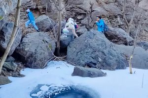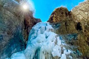山谷深处,一道高10米、宽5米的冰面飘于崖边,像壮美的瀑布一样,冰瀑右下边的冰面已经被“撕破”,露出后面的凹型空洞,宛若花果山上的水帘洞。洞口的冰瀑珠帘玉垂如在开半帘的厚重帏幕帘,让洞里充满神秘感。近距离接触冰瀑,由上而下的流水冻结了各种姿态的冰瀑,非常震撼,两边黝黑的岩石衬托着冰瀑更加洁白迷人。