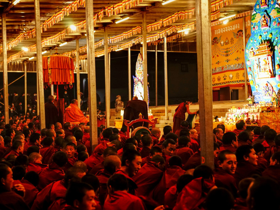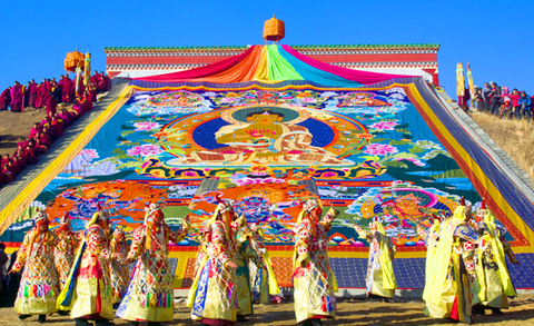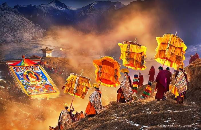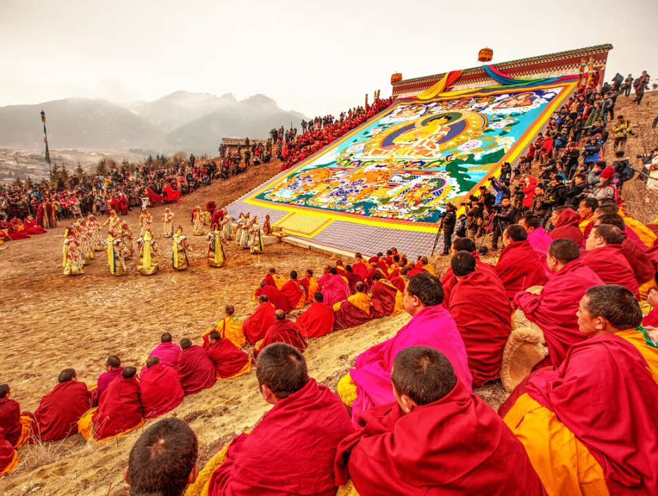 早餐后,我们从酒店集合出发,步行前往【赛赤寺(晒佛节)】(行程约:1KM,步行约 15 分钟,游玩约 3 小时)。冬季晒佛节格外热闹,寺外雪地早挤满裹厚藏袍的信徒,喇嘛们抬着巨大的红布佛像沿坡而上,佛像在白雪映衬下格外醒目。寒风里,经幡猎猎作响,信徒们手转经筒、煨桑祈福,桑烟混着雪粒飘向天空,佛像展开后,众人俯身叩拜,场面庄重又温暖。