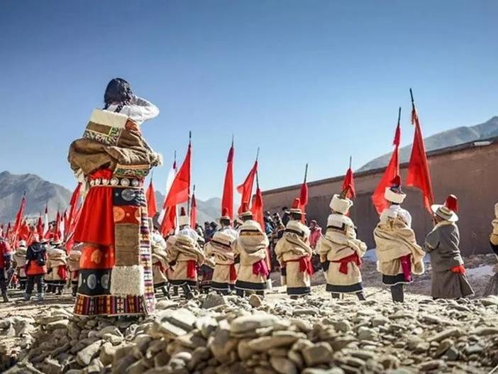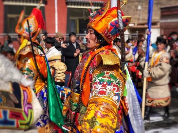 早餐后,我们从酒店集合出发,乘车前往【西仓寺(亮宝节)】冬日的西仓寺被厚雪覆盖,寺庙金顶在晨光中闪着微光。各部落的藏族同胞身着绣金藏袍,头戴珊瑚玛瑙头饰,举着经幡列队而行,宝物在白雪映衬下格外夺目。喇嘛们吹响长号,桑烟混着雪粒升腾,金刚法舞的面具在寒风中晃动,舞步踏碎积雪发出咯吱声,整个场面庄重又热闹。