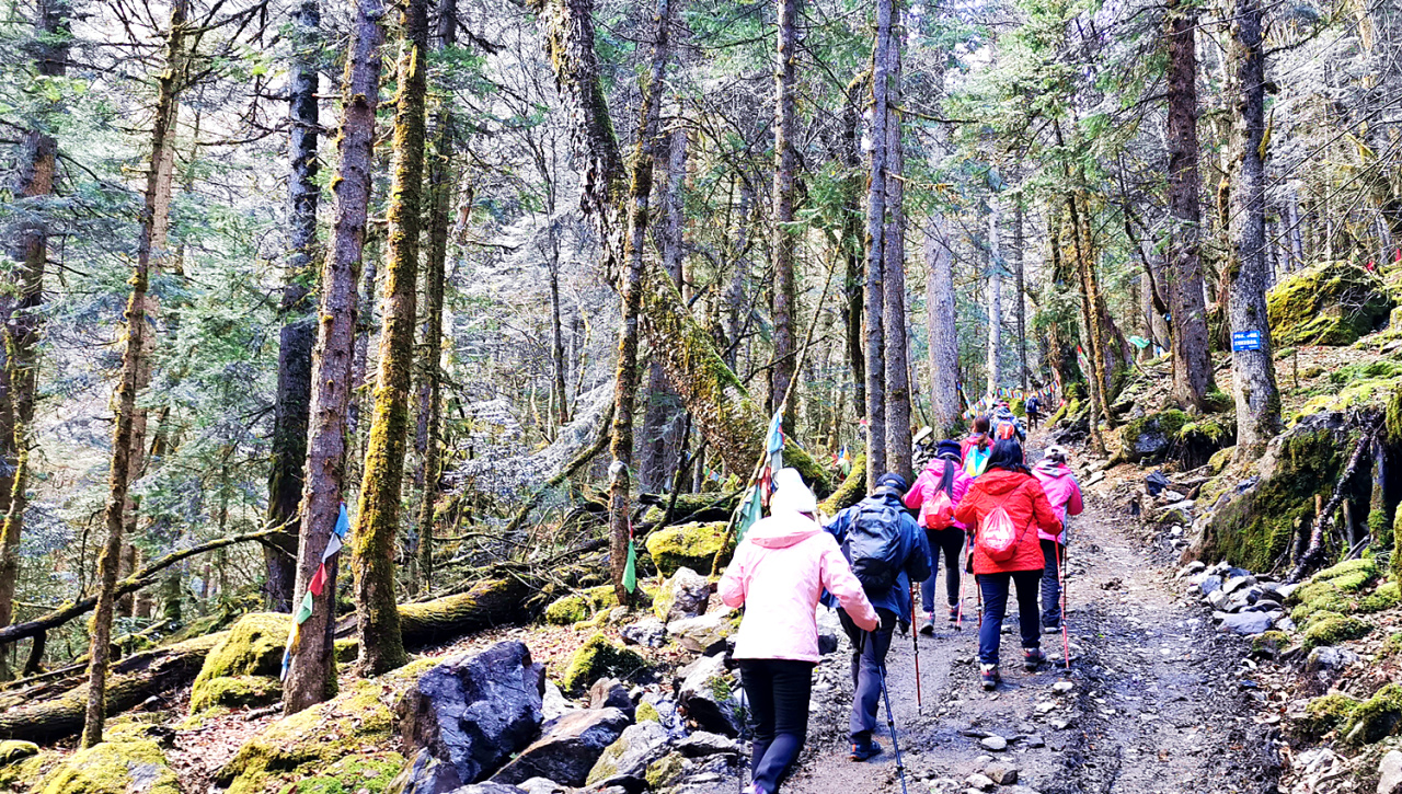 清晨用完早餐后, 从雨崩村出发,经高海拔原始森林及杜鹃丛林,徒步将近2小时后翻过海拔3900米的上那宗拉垭口,直至雨崩河底随后穿过一片原始松树林,约1小时后抵达海拔3600米的中日联合登山队“笑农大本营”。1991年由中日联合登山队修建而成,是登梅里雪山卡格博峰的一个大本营,去雨崩村旅游必去的一个地方,风景优美。