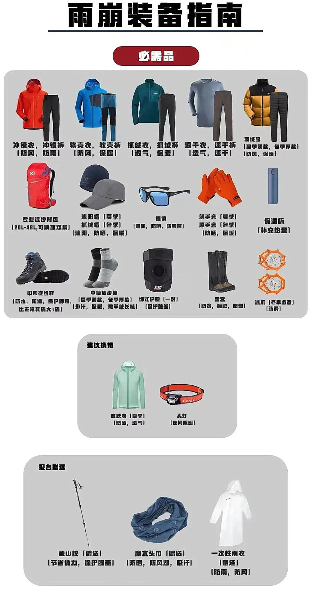 服装:白天速干衣+软壳/硬壳冲锋衣,早晚温差大需添加羽绒服/厚抓绒(冬季)。