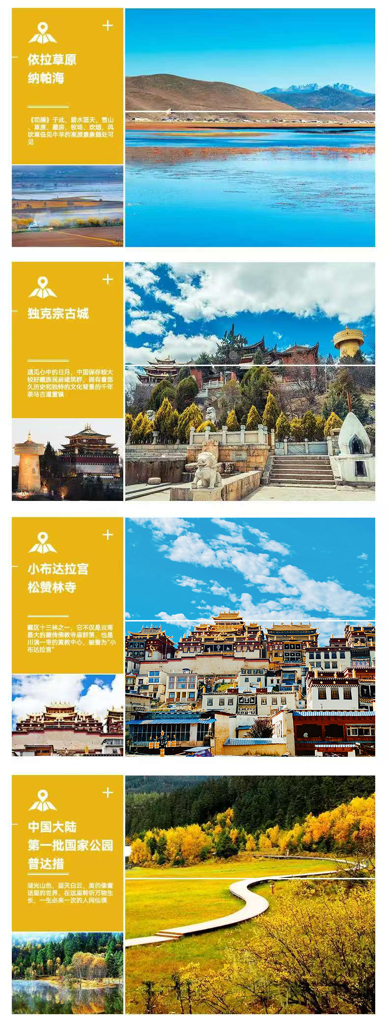 早餐后出发前往松赞林寺景区我们乘坐景区环保车到达拉姆央措湖,徒步转湖后进入松赞林寺参观游览。噶丹•松赞林寺是云南省规模蕞大的藏传佛教寺院,有着“藏族艺术博物馆”之称,在整个藏区都有着举足轻重的地位,因其外观布局酷似布达拉宫,所以又有“小布达拉宫”之称;游览完松赞林寺前往《司滕》取景地依拉草原【纳帕海】,草原,湖泊,牧场,牛羊成群,融合了整个藏区风光。中餐后前往有着风花雪月之称的南诏古国【大理】,高速行驶约3小时后抵达大理古城,入住古城周边酒店后自由活动;夜晚可以自行前往大理古城,自由漫步古城的青石板道上,感受经过千年洗礼依旧繁华的【古城门楼】、【五华楼】和【洋人街】,前往人民路和叶榆路上感受原始白族人民的市井生活,携三五知己,找个地摊或是小酒馆,尽情享受这舒适轻松的时光。