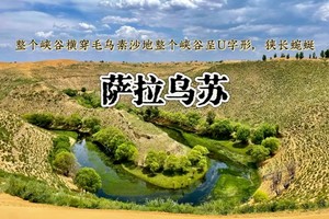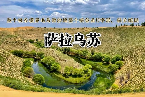 萨拉乌苏沙漠大峡谷 位于乌审旗无定河镇大沟湾,海拔标高1300米。大峡谷由8大沟湾组成。东西走向,历经风雨剥蚀、山洪冲刷而成,是目前中国最大的沙漠大峡谷,属于罕见的旱地自然奇观。