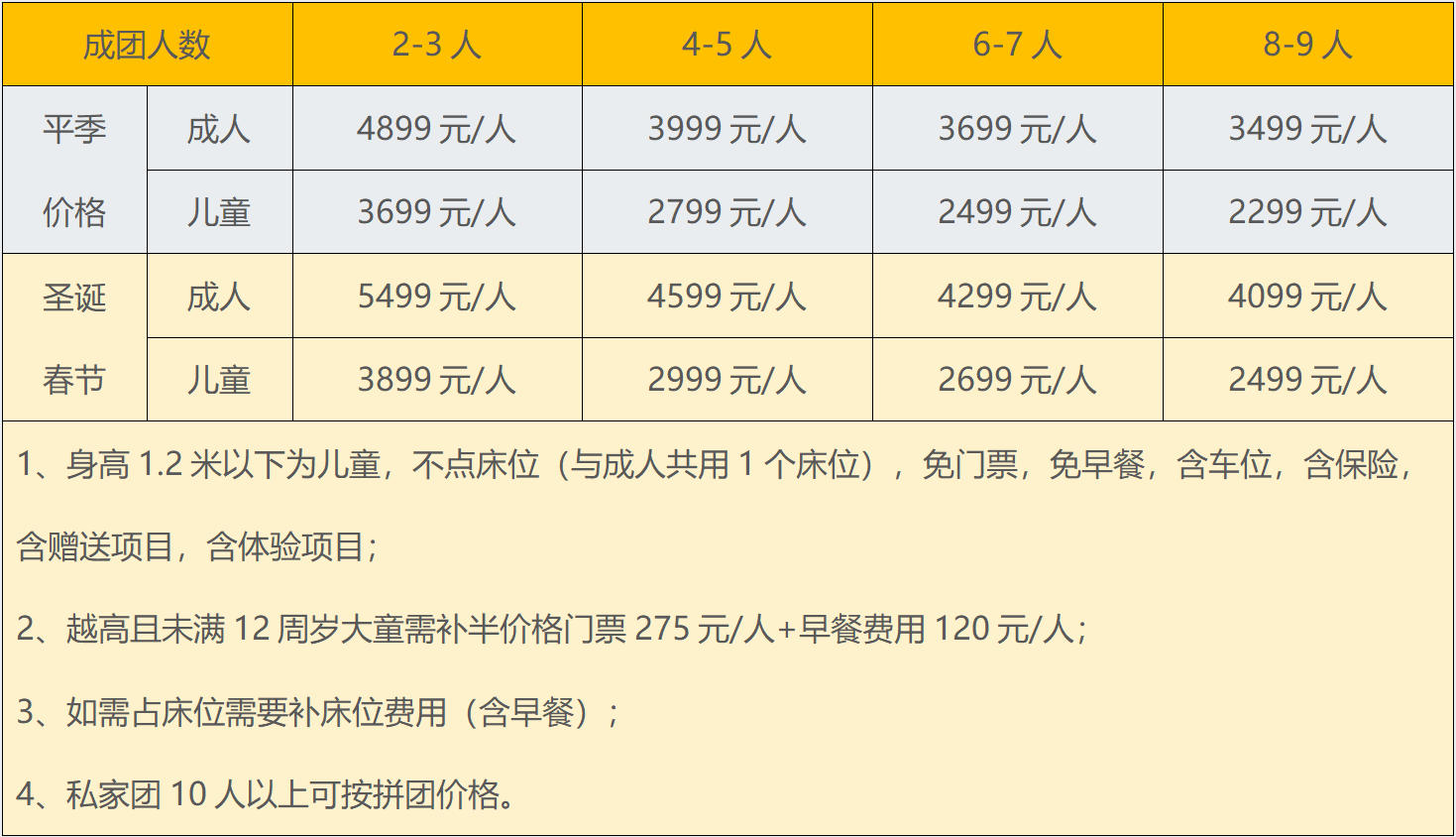 ▷房差:自然拼房2-3人标准间,如不愿拼房或拼不了房者须补单房差(平季900元/人,圣诞/春节1500元/人);