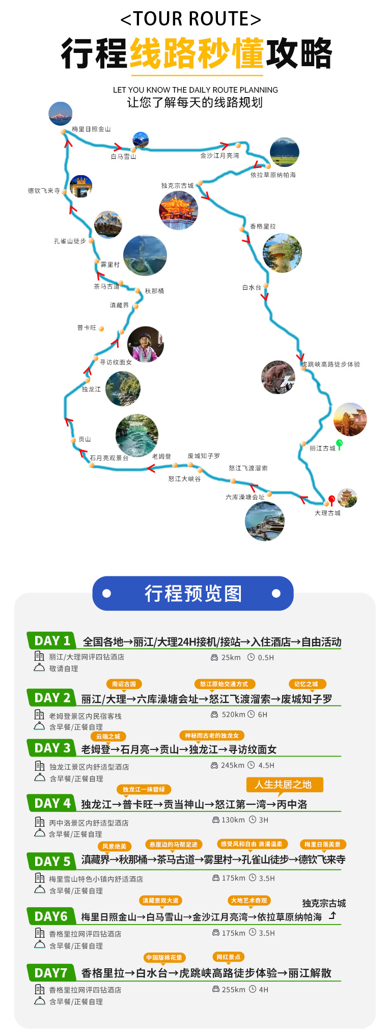 ▷交通:不包含各地到达丽江集散的往返大交通费用(如:机票和高铁火车票等,提前预定通常折扣都会很低);