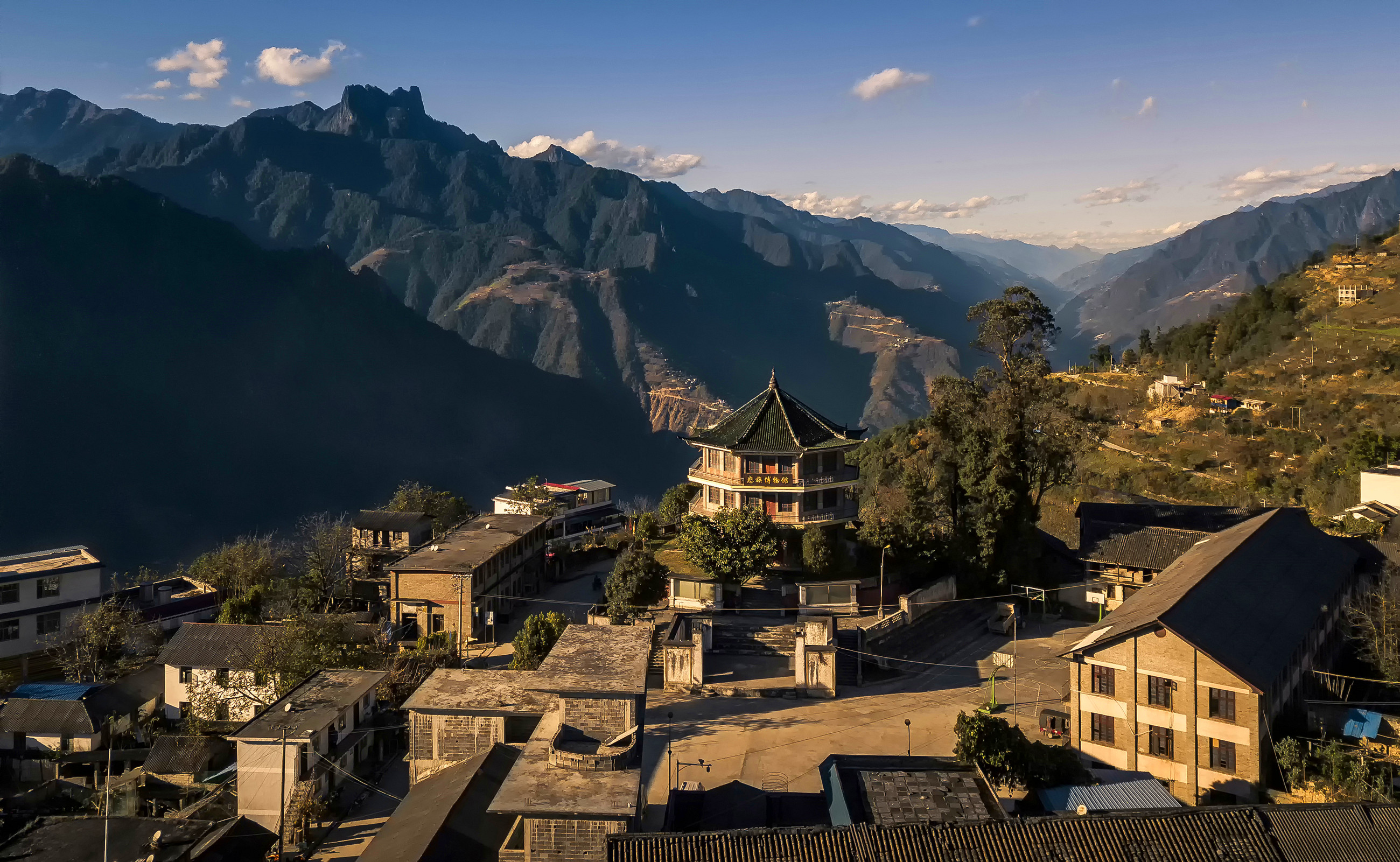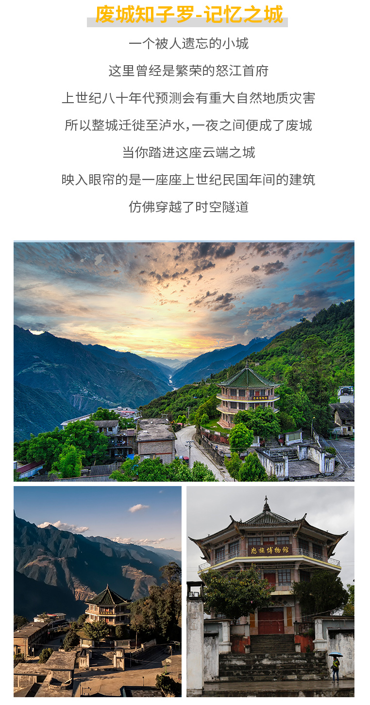 随后体验怒江【飞渡溜索】,它是怒江境内极具代表性且典型的原始交通工具,至今仍然普遍使用中。随后前往【“废城”知子罗】,一个被人遗忘的小城,当你踏进这座云端之城,映入眼帘的是一座座上世纪民国年间的建筑,仿佛穿越了时空隧道;这里曾经是繁荣的怒江首府。上世纪八十年代预测会有重大自然地质灾害,所以整城迁徙至泸水,一夜之间便成了废城。傍晚入住老姆登当地特色民宿客栈,欣赏【老姆登】基督教堂,皇冠山日落晚霞。