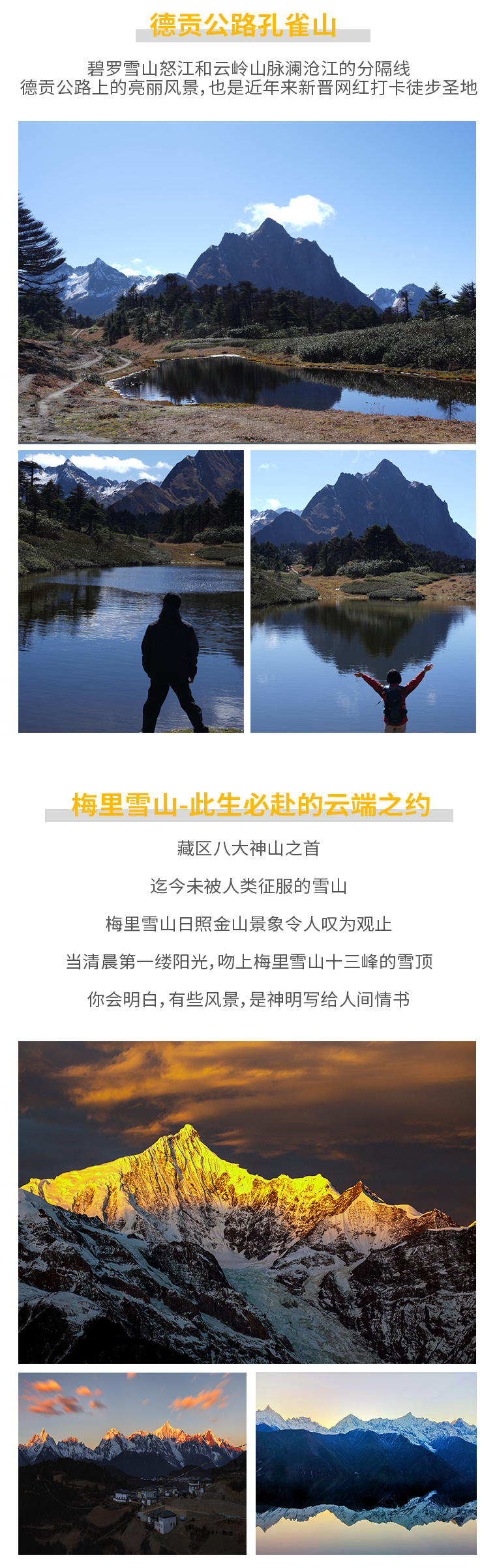 这里是碧罗雪山怒江和云岭山脉澜沧江的分隔线,德贡公路上的亮丽风景,也是近年来新晋网红打卡徒步秘境圣地,也是梅里转山外转经之路。随后领队带领大家轻徒步体验,徒步约4.5公里,徒步约2-3小时,高原徒步请大家根据自身体力量力面行,切不可逞强。徒步过程中需穿越森林、草场,高山湖泊,尤其是有一大片的杜鹃花灌木丛,花季很壮观,随后抵达天心十二湖观景点,此时你回头便看到孔雀山近在眼前,在大小不一的湖泊点缀下,美的令人窒息。