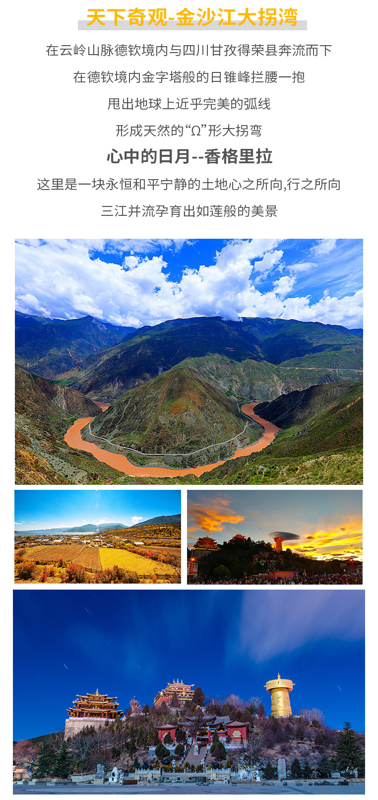早上起来前往景区观景台观赏梅里雪山【日照金山】,当第一缕朝阳把【梅里雪山】主峰“卡瓦格博”染成了金色,那耀眼的金色让每个人心潮澎湃,内心震憾。观赏完日照金山后自行吃罢早餐驱车途经德钦县城后翻越【白马雪山】到达垭口,站在此处居高临下,美景尽收眼底。随后【金沙江月亮湾】,金沙江遭遇了一座浑圆的金字塔型山峰,金色的江水于是绕着山峰流出了一个标准的“倒Ω”形,这就是很多摄影作品中的金沙江大拐弯;
