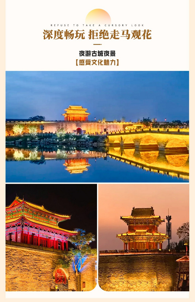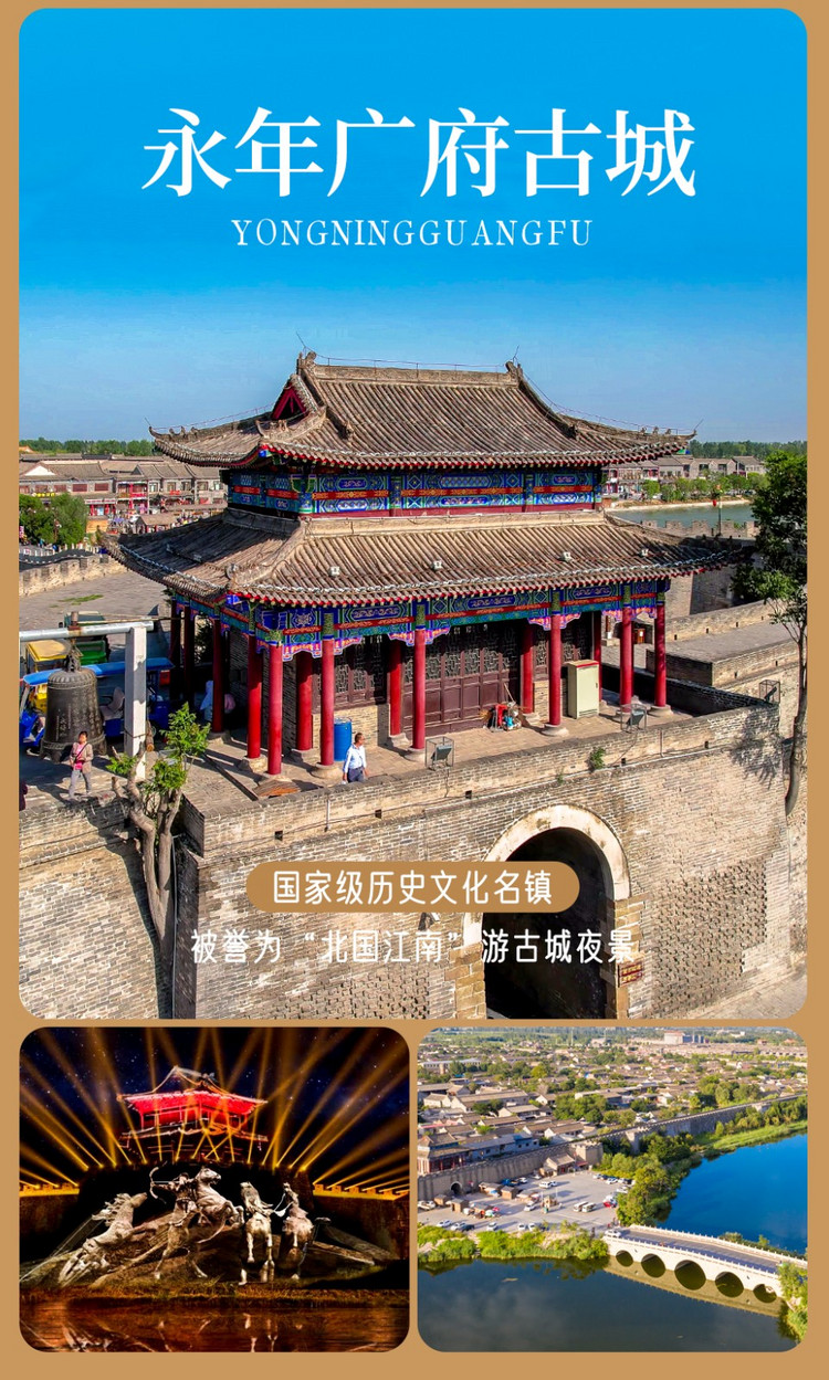 游玩尽兴后,我们前往邯郸市【永年广府古城】(车程约2.5小时)古城邯郸一座等了你三千年的城。一部邯郸史,半部在广府!广府古城是一座集历史文化、自然风光和太极文化于一体的旅游胜地。广府古城,这座始建于春秋时期的古城池,历经数千年风雨,依旧保持着其古老的规模和雄伟的城址。它堪称中国古代城市建筑的活化石,见证了历史的变迁。古城的城墙高达12米,厚达8米,周长约4.5公里,坚固无比。城墙上错落有致地分布着四座城楼、四座角楼和64处敌楼,它们宛如忠诚的卫士,见证了古城的兴衰。漫步在城墙上,仿佛能穿越时空,听到古代战争的金戈铁马之声,感受到士兵们戍守城池的坚毅决心。