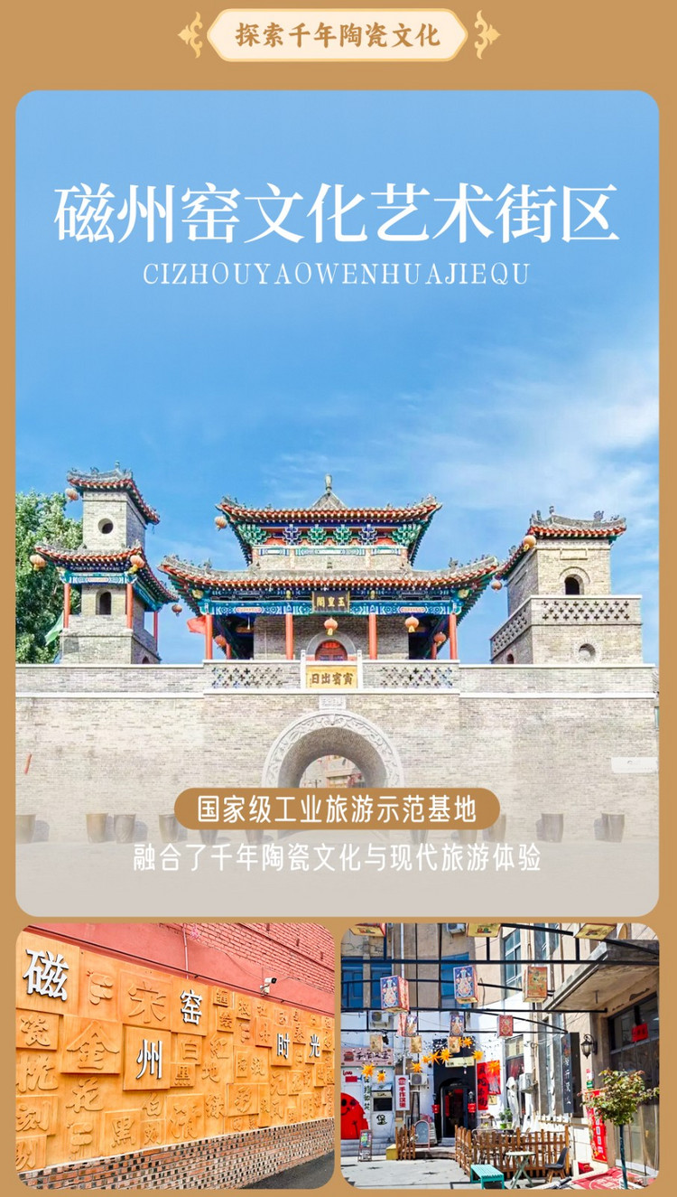 15:00左右,结束游览,前往【磁县磁州窑艺术街区】磁州窑艺术街区:千年窑火不熄,黑白美学殿堂。一座活着的民窑博物馆,一场可触摸的非遗体验。在邯郸磁州窑艺术街区,千年陶瓷文化活态传承:匠人坚守古法拉坯施釉,大家可亲手捏塑专属陶器,现代艺术家更将黑白纹样融入潮流设计。这里每一件器物都带着泥土的温度,让快节奏的都市人在慢创作中重获心灵宁静。走进这片街区,仿佛穿越时光,既能看到古朴的陶艺作坊,也能遇见创意十足的现代艺术空间。无论是欣赏陶瓷之美,还是参与制作过程,都能让人沉浸其中,流连忘返。
