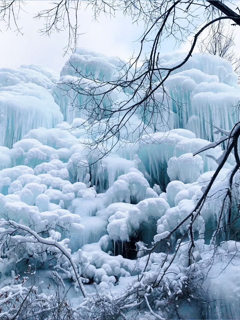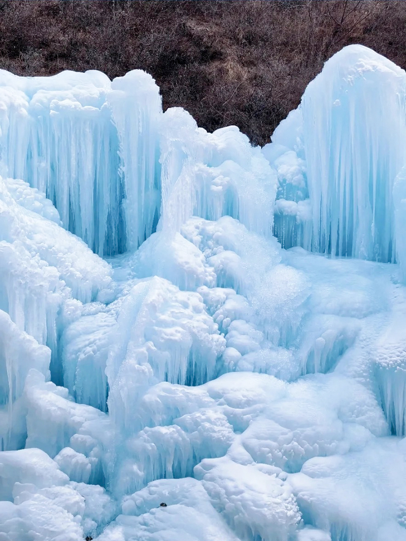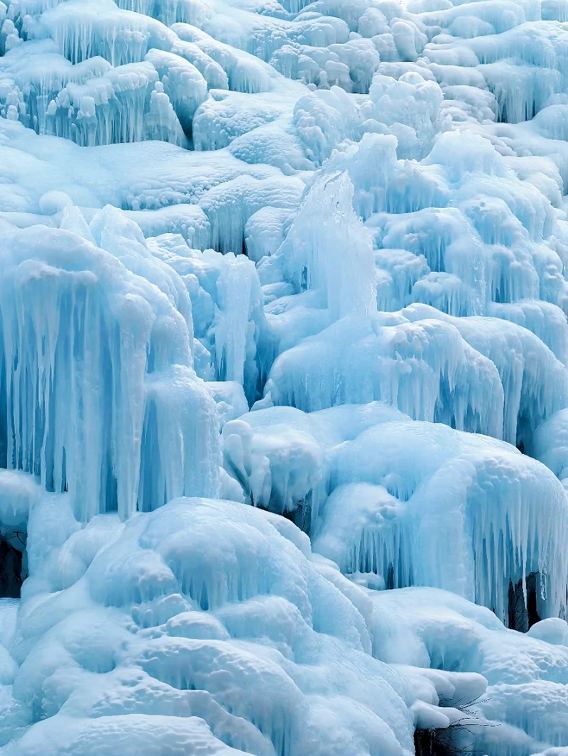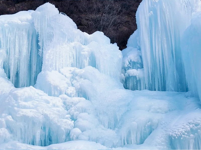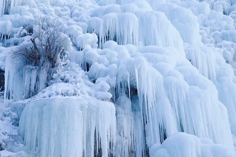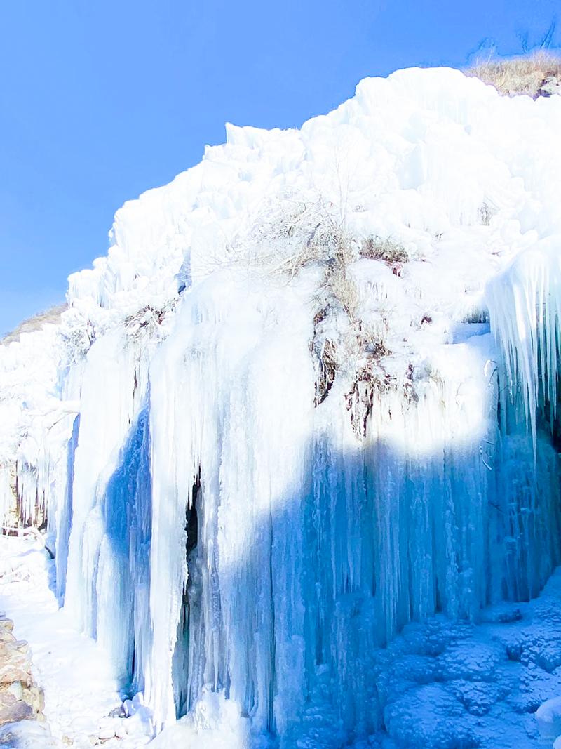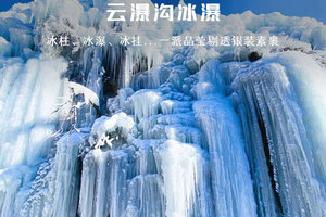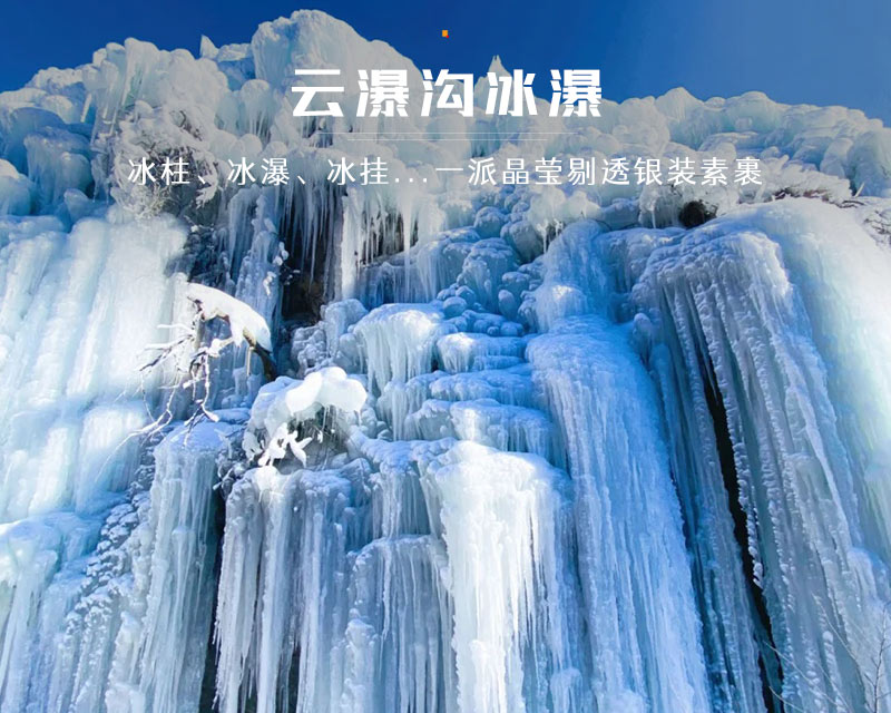 路线全程共10公里,由云瀑沟景区开始徒步,一路经过栈道缓缓上升到达山顶到达半块豆腐山,沿山脊继续前行,最后下降到烧窑峪。冰瀑面积达上千平方米,冰瀑依山势而走,浑然天成,步入景区,沿着小径向前,两旁一片冰雕玉砌,一簇簇晶莹剔透的冰柱高悬在峭壁之上,冰幔、冰挂层层叠叠、错落有致、形态各异。