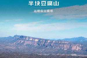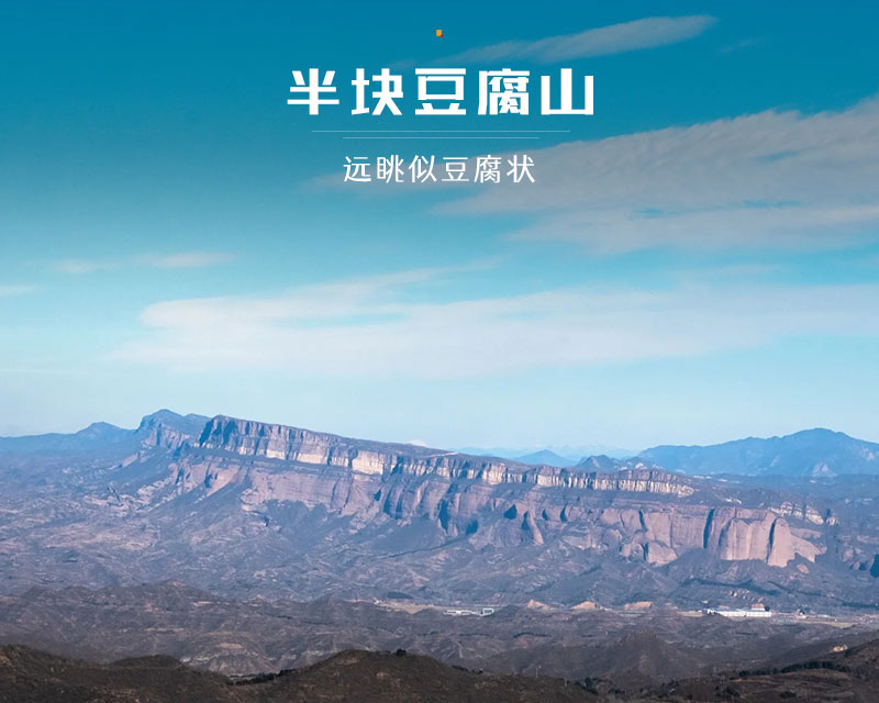 半块豆腐山,位于延庆县与河北赤城县交界处。属于旧县镇,西南距延庆镇约16公里。为延庆盆地西北侧的山峰,海拔1157米,属军都山。山势较缓,顶部岩体面平坡陡,远眺似豆腐状,故名。山区植被稀疏,山麓一带产杏、苹果。