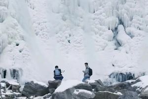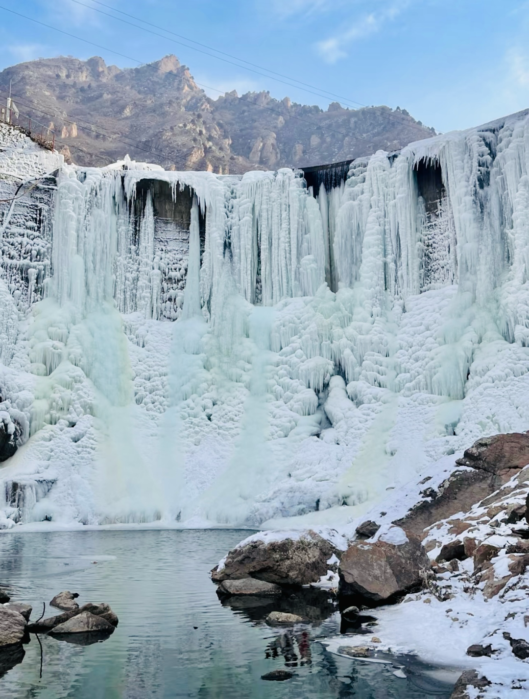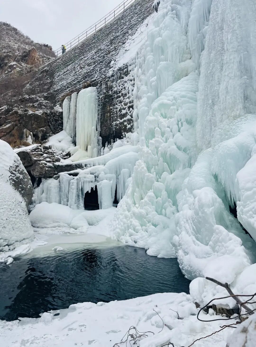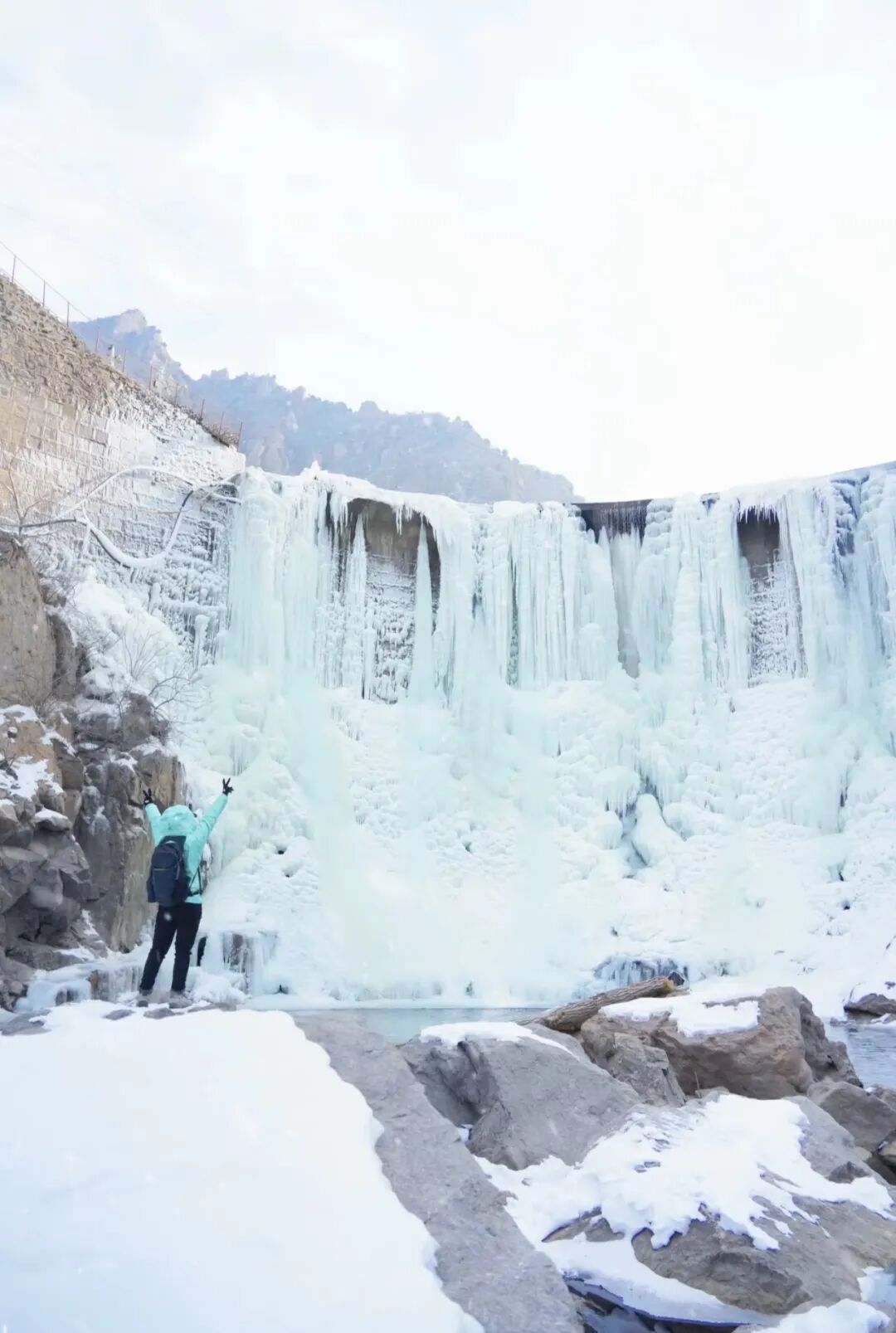 前段闲适畅快,沿着山腰公路进发,再顺着河床土路行进,四面开阔心胸也随之舒畅。中段集趣味与挑战于一体的河道踏冰路线,景致富于变化,有平坦的冰面,有缓降的冰坡,有沉静的冰潭。这段路线间杂河道巨石略有挑战。后段奇伟壮美:冰瀑远远即映入眼帘,置身其下,与冰瀑、与山、与天融为一体,让人赞叹造物的神奇。此处也是绝佳的打卡点。