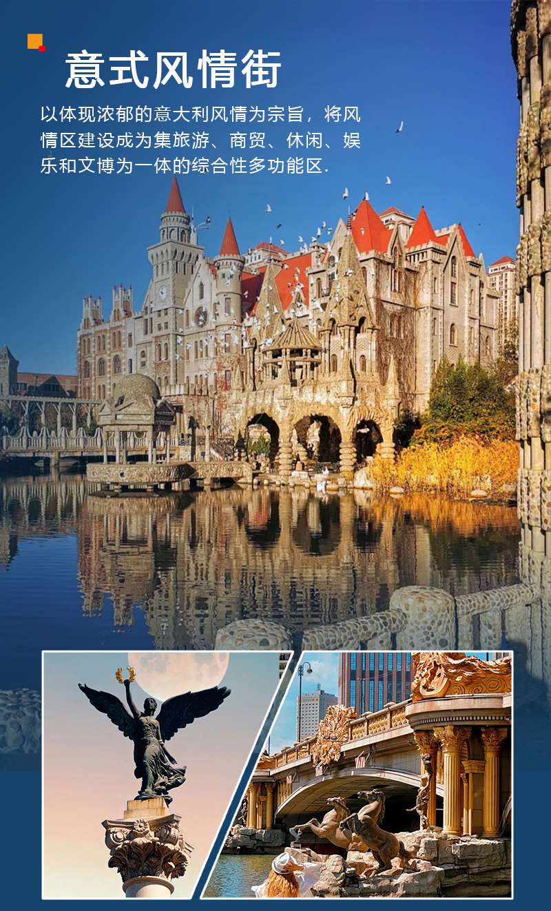 以体现浓郁的意大利风情为宗旨,将风情区建设成为集旅游、商贸、休闲、娱乐和文博为一体的综合性多功能区。 景区紧挨着海河,有大量意大利风情建筑;在意大利老租界里,还有梁启超的饮冰室、曹禺故居、李叔同故居、袁世凯及冯国璋的府邸等。