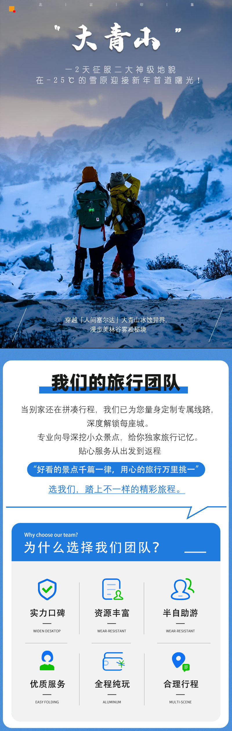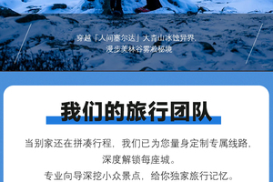 雪鹰为企业提供专属定制服务,其中包含:户外轻探险类:高端徒步(沙漠穿越,戈壁穿越,古道徒步,草原徒步等);旅行式团建路线;主题类(U棒团队、武林风云);会议/年会等一站式解决方案!咨询策划联系人:寒雪18600558113同微信